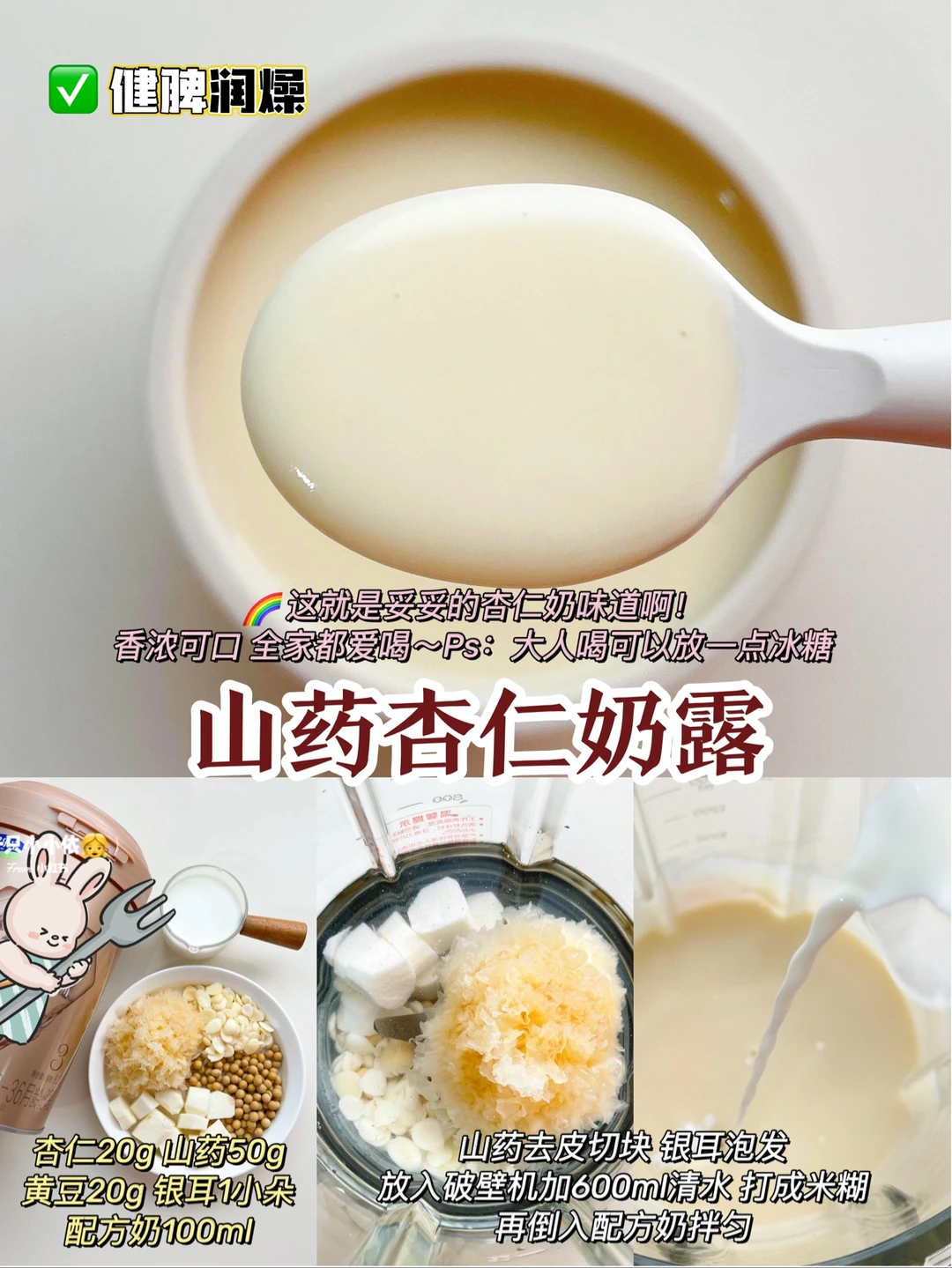 👉食材:杏仁20g、山药50g、黄豆20g、银耳1小朵、清水600ml 、配方奶100ml