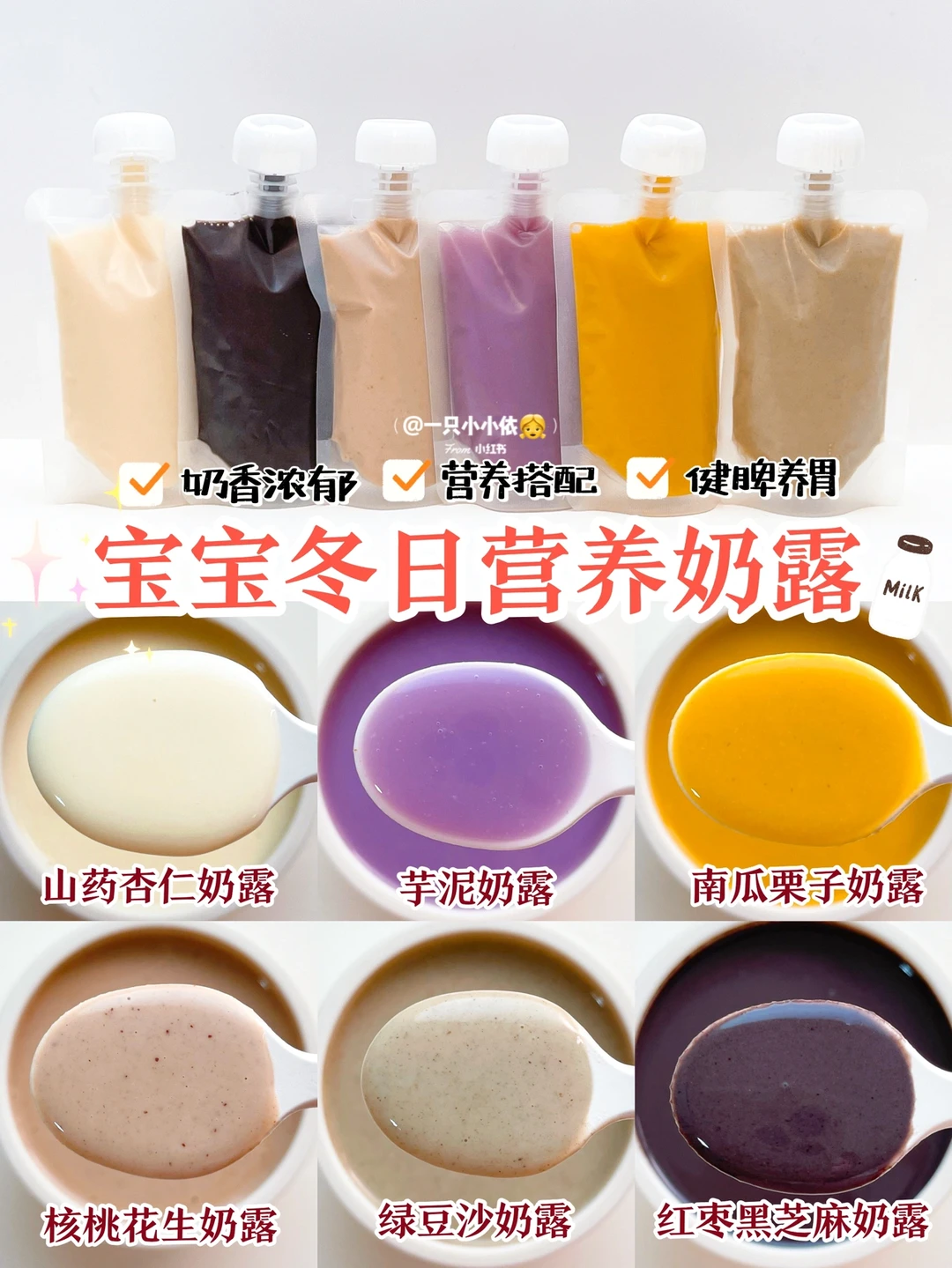 ❄️冬天是滋补养生的好时节,6种好喝不重样的宝宝奶露,一周不重样,帮助宝宝胃口大开吃嘛嘛香[赞R]均衡搭配的营养食材,加上香甜补钙的配方奶,不仅奶香浓郁,更适合宝宝口味,营养也up up!全家大小都爱喝哦👏🏻