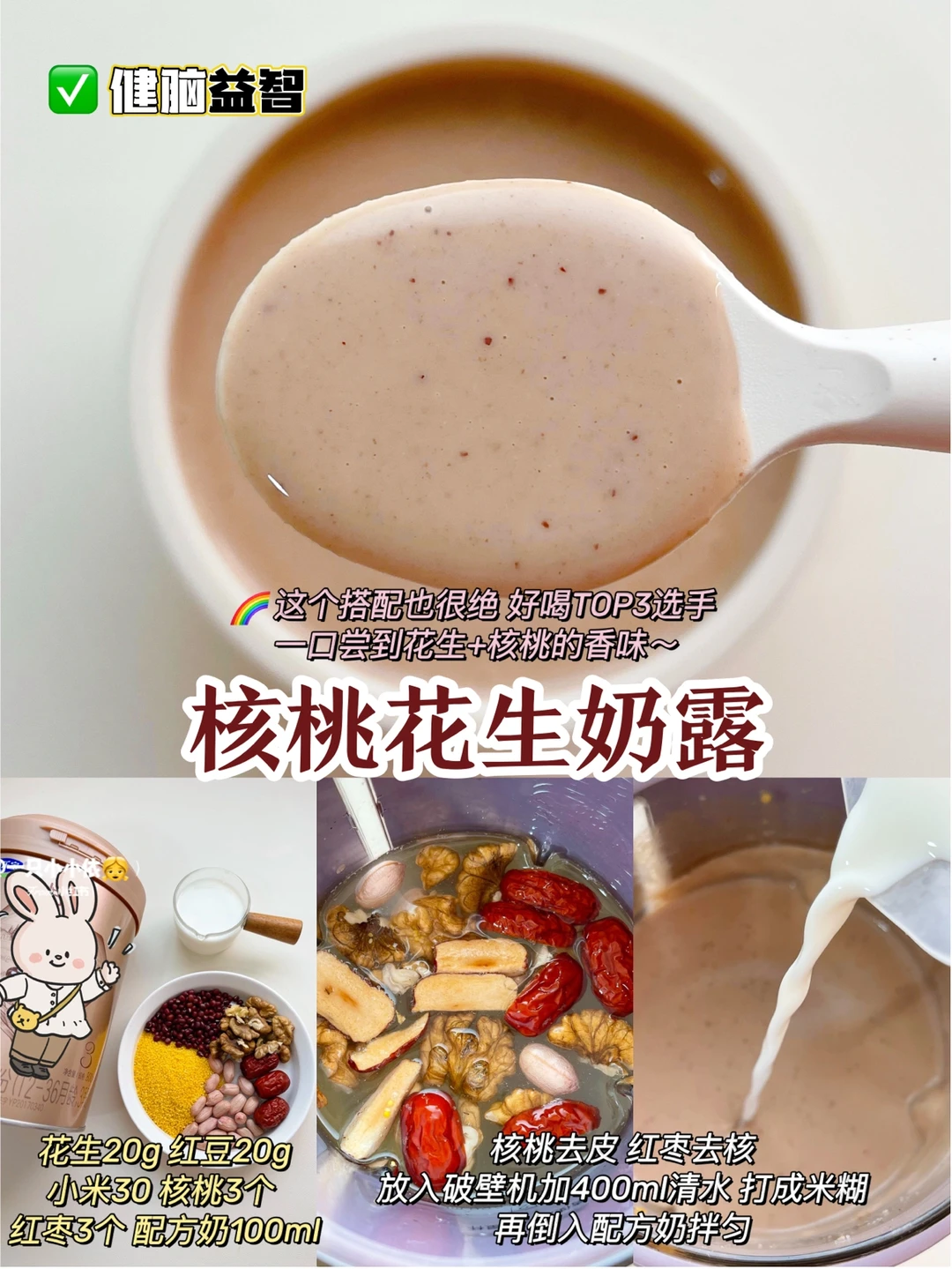 👉食材:红豆20g、花生20g、小米30g、红枣3个、核桃3个、清水400ml、配方奶100ml