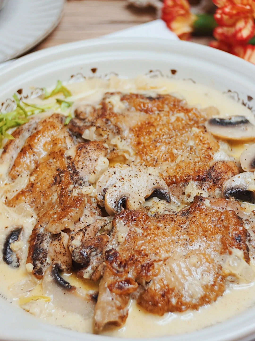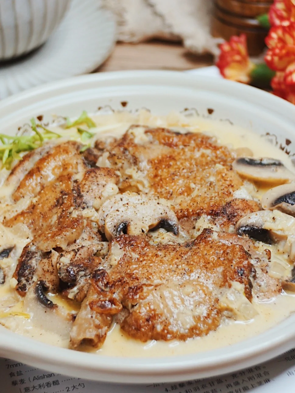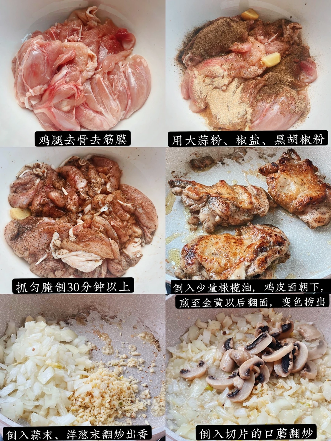 鸡腿3个 淡奶油100ml 洋葱半个 口蘑6个 大蒜半头