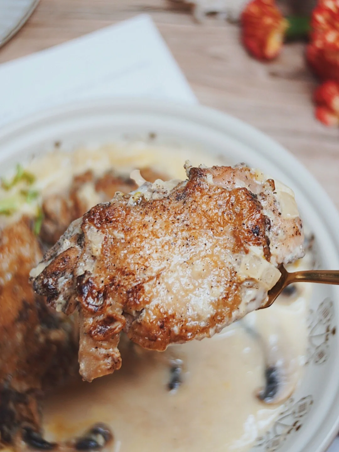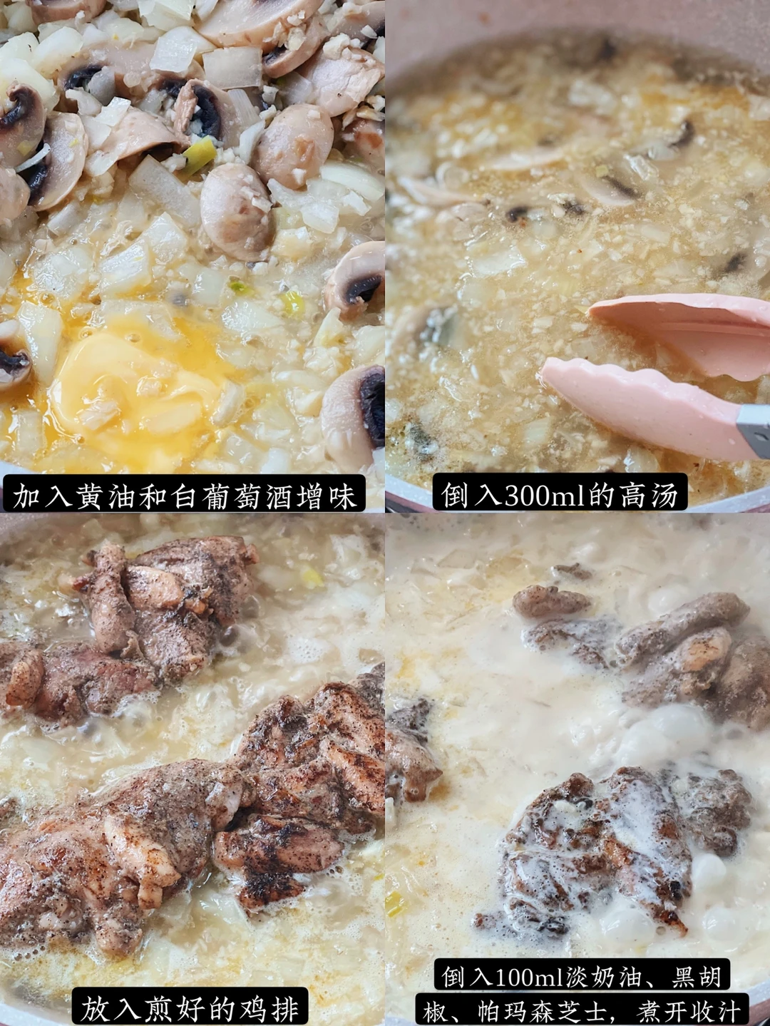 4️⃣待酒精稍微挥发一点以后,倒入高汤煮至沸腾,放入煎好的鸡排,起锅前倒入淡奶油、帕玛森芝士和现磨黑胡椒粒,煮开收汁