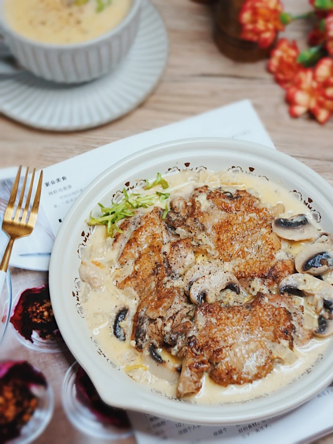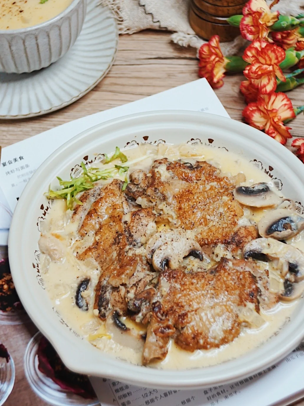 鸡皮煎至焦黄,融合甜甜的酒香和浓郁的奶香