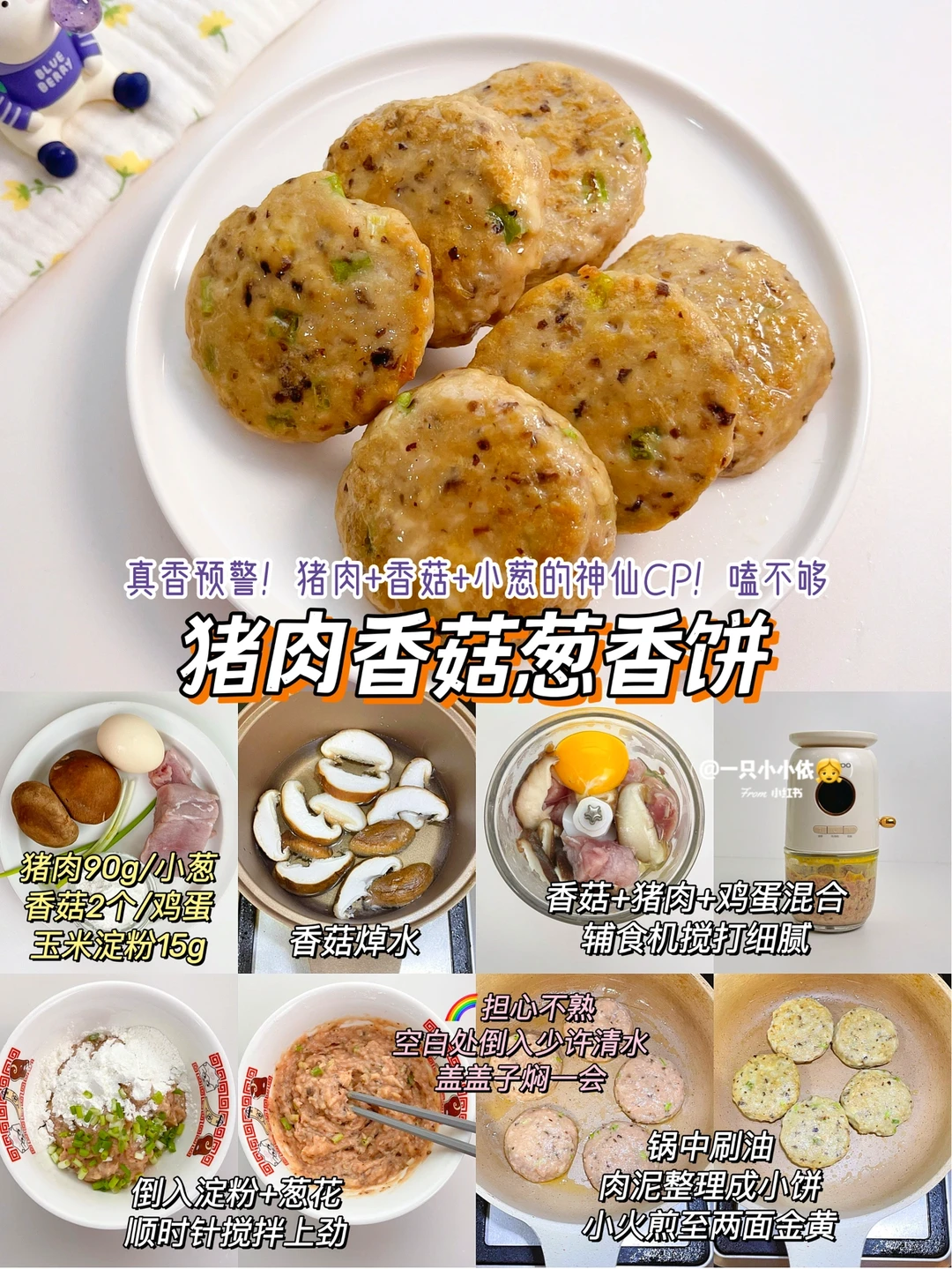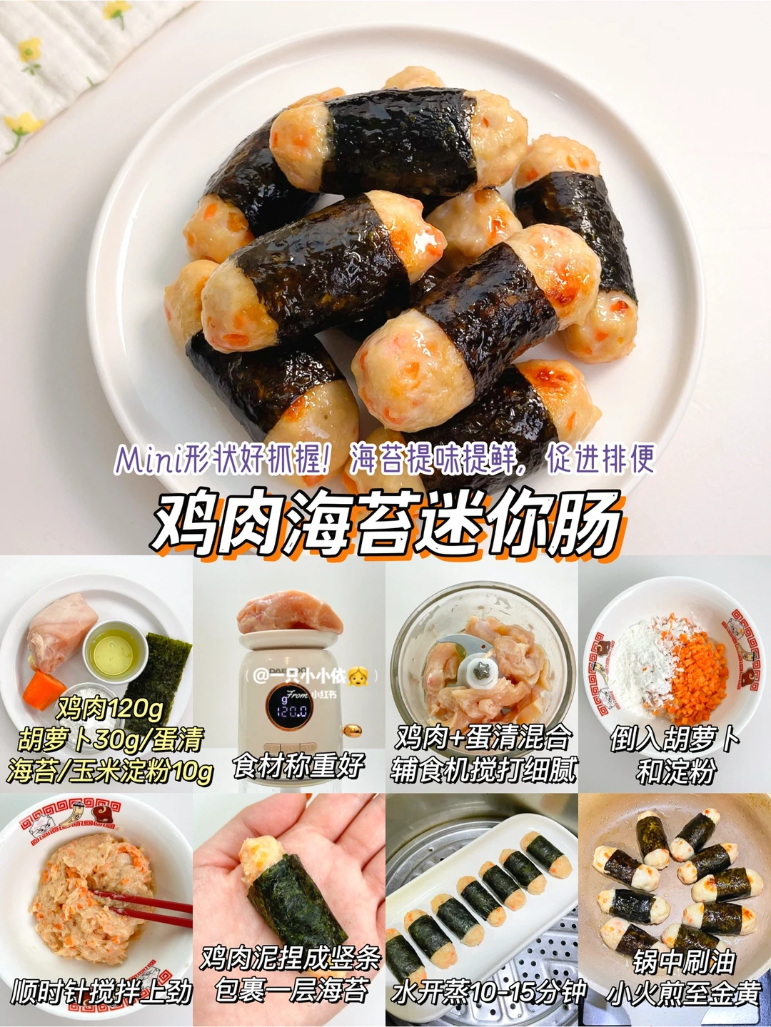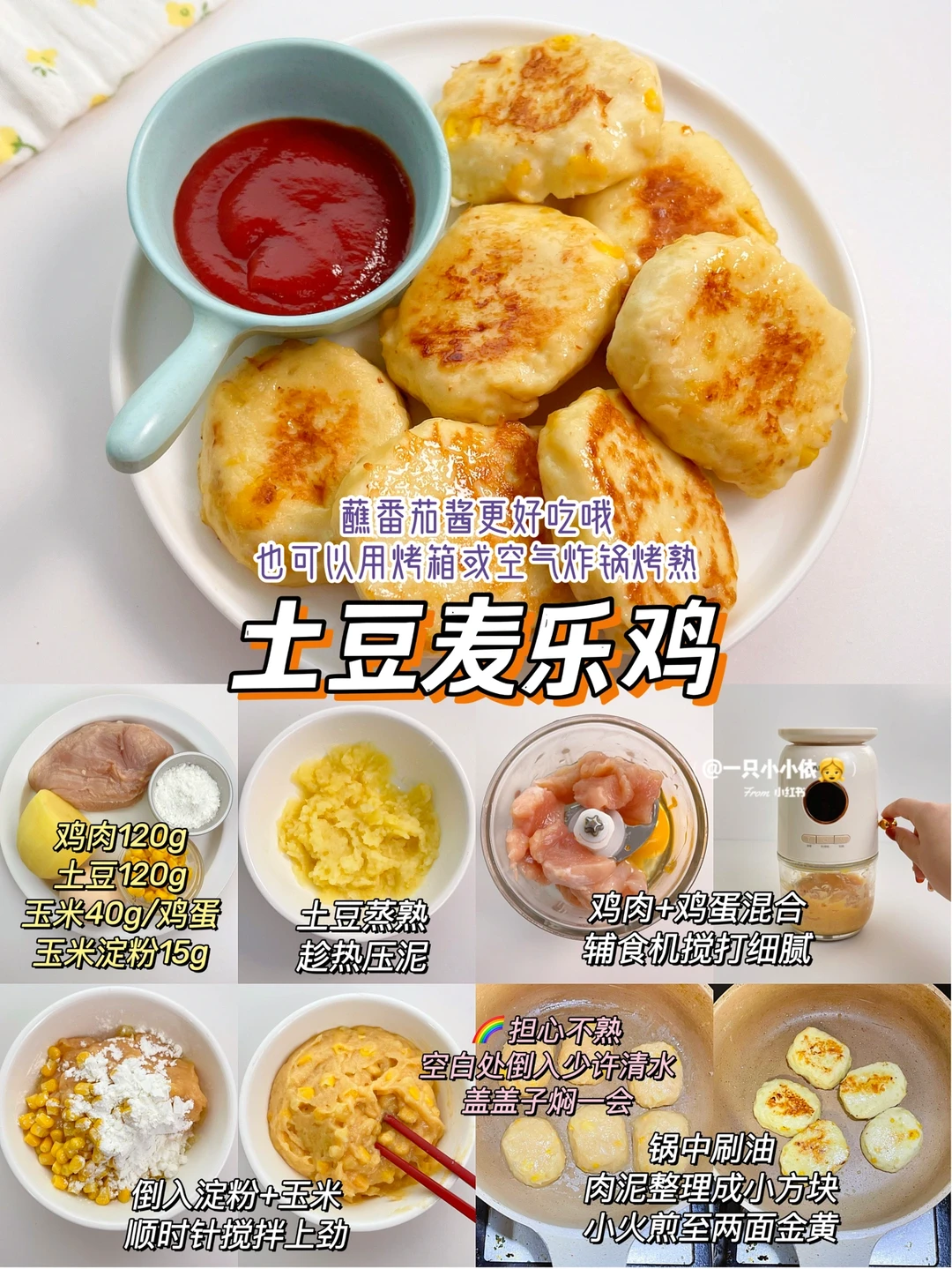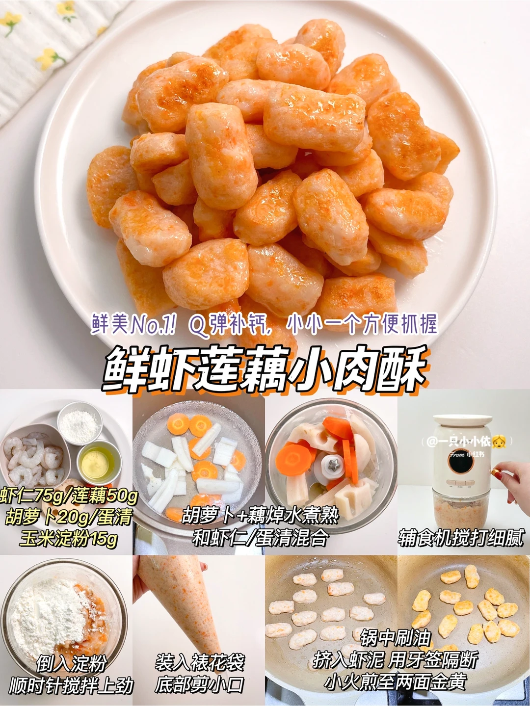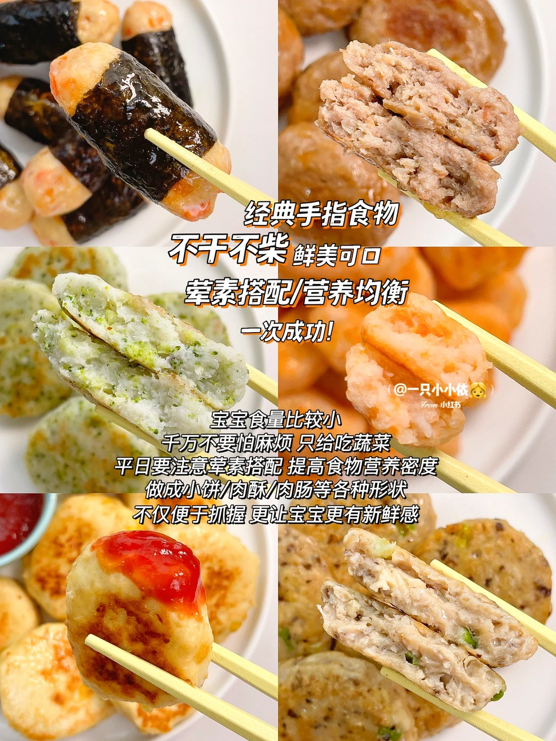 💁‍♀️今天是宝宝喜欢的经典手指食物特辑,荤素搭配营养加倍!肉肉吃起来软嫩Q弹,一点都不会干柴哦[赞R] ✨我还特意做成了小饼、迷你肉肠、小肉酥等形状,变着花样做不仅可以提高宝宝进食兴趣,而且也方便宝宝抓握,帮助自主进食~食材常见,简单0翻车,教程来啦 · 🌈肉类手指食物食用指南 每个教程里我都搭配了蔬菜和肉肉,营养比较均衡啦,可以作为宝宝早晚餐或午餐的主食,再搭配粥、米糊、米粉、面条、炒菜等辅食一起享用~ · 🌈不翻车经验分享: ✨按照比例来比较容易成功哦 ✨全程小火慢煎,切记不要大火; ✨如果怕肉不熟,可以沿着锅边在空白处倒入少许清水,盖上盖子焖熟即可 . ✅1岁内不加调料,1岁上可加少许盐和宝宝酱油 ✅蛋清过敏可不加 · 🦐鲜虾莲藕小肉酥 🔹食材:虾仁75g、莲藕50g、胡萝卜20g、蛋清、玉米淀粉15g 🔸步骤:胡萝卜+藕焯水煮熟,和虾仁、蛋清混合,辅食机搅打细腻;倒入淀粉,顺时针搅拌上劲,装入裱花带,底部剪小口;锅中刷油挤入虾泥,用牙签隔断,小火煎至两面金黄 · 🐔鸡肉海苔迷你肠 🔹食材:鸡肉120g、胡萝卜30g、蛋清、海苔、玉米淀粉10g 🔸步骤:食材称重好,鸡肉+蛋清混合搅打细腻,倒入胡萝卜和淀粉,顺时针搅拌上劲;鸡肉泥捏成竖条,包括一层海苔,水开蒸10-15分钟;锅中刷油,小火煎至金黄 · 🍄猪肉香菇葱香饼 🔹食材:猪肉90g、香菇2个、小葱、鸡蛋、玉米淀粉15g 🔸步骤:香菇焯水,和猪肉+鸡蛋混合搅打细腻,倒入淀粉和葱花,顺时针搅拌上劲;锅中刷油,肉泥整理成小饼,小火煎至两面金黄 · 🐮汉堡牛肉饼 🔹食材:牛肉120g、土豆60g、洋葱30g、胡萝卜30g、玉米淀粉15g 🔸步骤:土豆+胡萝卜蒸熟,除淀粉外食材混合,辅食机搅打细腻;倒入淀粉顺时针搅拌上劲;锅中刷油,肉泥整理成小饼,小火煎至两面金黄;调一个料汁(宝宝酱油+淀粉+清水),倒入锅中裹匀肉饼,大火收汁 · 🥔土豆麦乐鸡 🔹食材:鸡肉120g、土豆120g、玉米40g、鸡蛋、玉米淀粉15g 🔸步骤:土豆蒸熟趁热压泥,鸡肉+鸡蛋搅打细腻,倒入淀粉+玉米,顺时针搅拌上劲;锅中刷油,肉泥整理成小方块,小火煎至两面金黄 · 🐟鳕鱼山药饼 🔹食材及步骤见图 · 下期见姐妹们!双击屏幕随时抄作业
