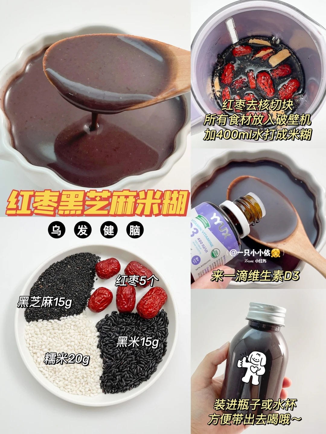 ✨食材:黑芝麻15 g、黑米15 g、糯米20 g、红枣5个、清水400 ml