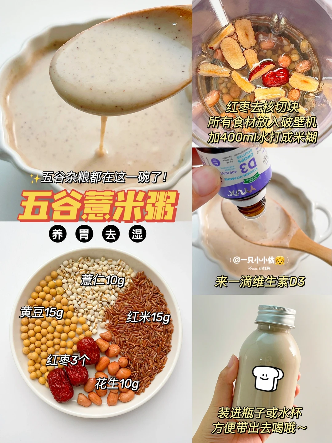 ✨食材:黄豆15 g、薏仁10 g、红米15 g、花生10 g、红枣3个、清水400 ml