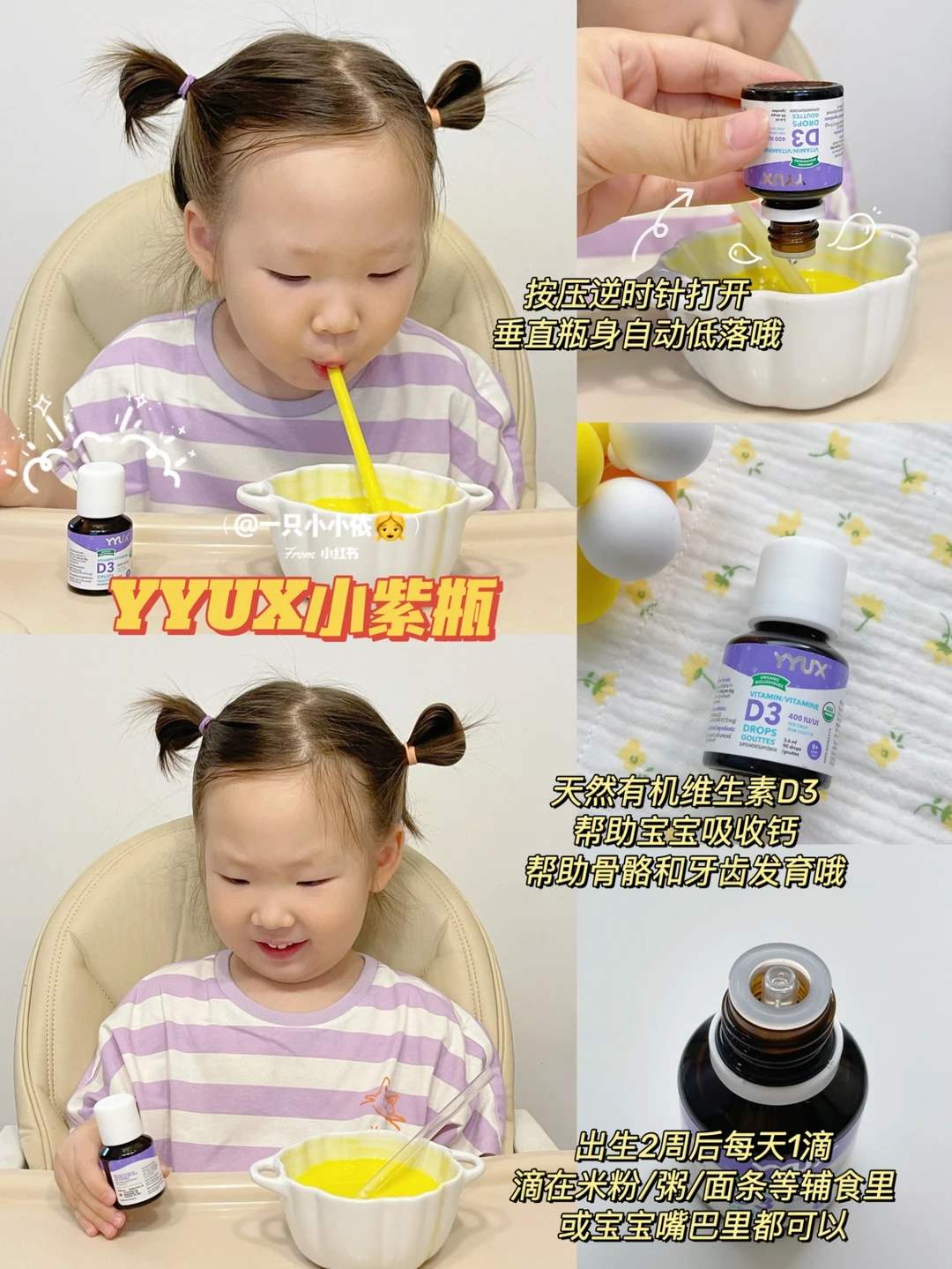 麻麻们应该都知道吧,宝宝出生2周后就要补充维生素D3了,因为宝宝的食物比较单一,无法从食物中获取;一旦缺少这种维生素,宝宝身体对钙的吸收容易不够,有得佝偻病的风险,还容易频繁夜醒,所以我们特别注意这一点,早早做好功课,给自家宝宝入手了这款YYUX小紫瓶,它经过双有机认证,可以有效的促进钙吸收。成分也很简单,只有天然有机的维生素D3和橄榄油[斜眼R]
