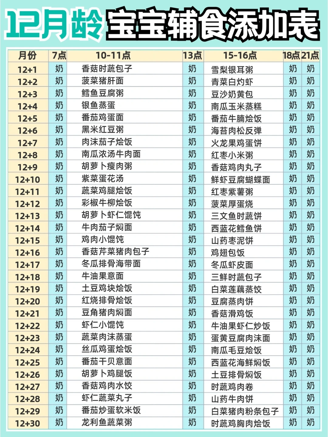▪️6-9月龄宝宝还在辅食摸索阶段,10-12月龄宝宝就会形成自己的用餐规律!图片有详细食谱哦,可以参考。