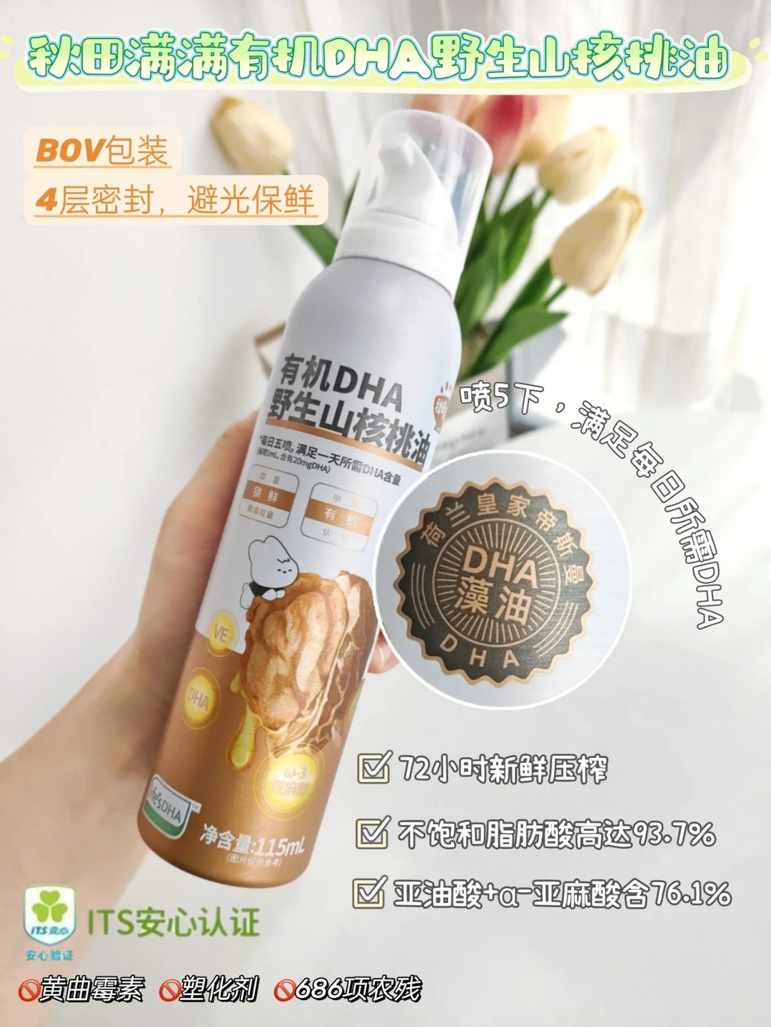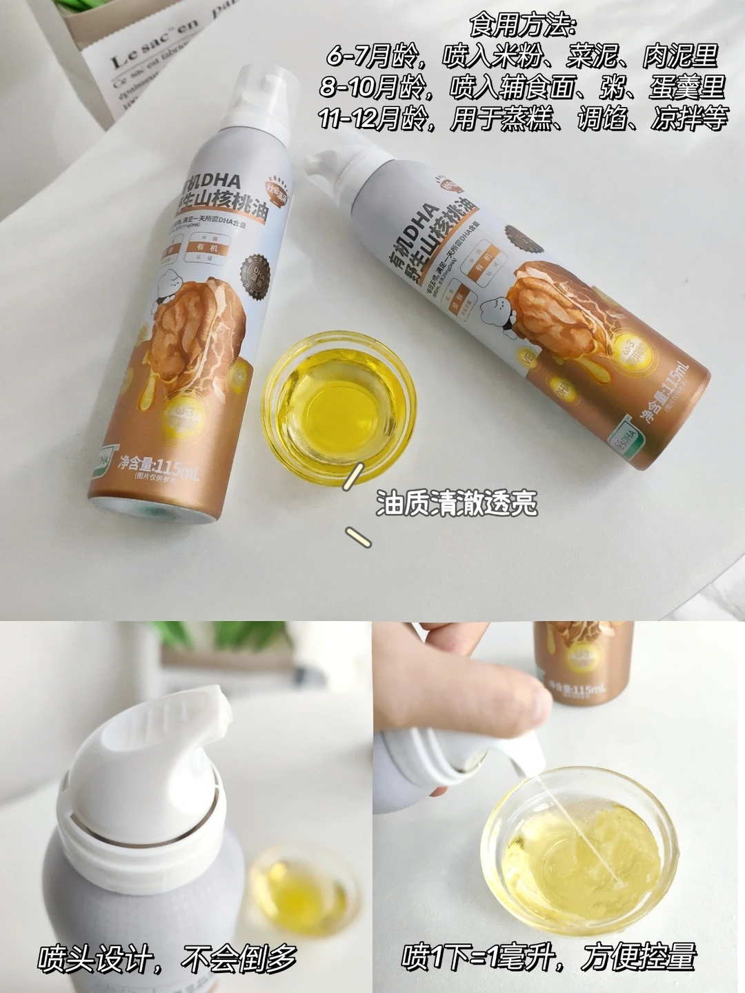 🔺我家宝宝吃的是秋田满满有机DHA野山核桃油,低温冷榨工艺,口感清淡,多不饱和脂肪酸含量高达93.7%,亚油酸和α-亚麻酸含量高达76.1%,能很好的给宝宝补充必须脂肪酸,并且秋田满满这款辅食油是含DHA藻油的,还是荷兰皇家帝斯曼DHA藻油呢,每天喷在辅食里,5喷就能满足宝宝每日DHA所需,营养美味,又好吸收!直接加在米糊里吃,或再加入肉泥、肝泥、菜泥、蛋羹里。