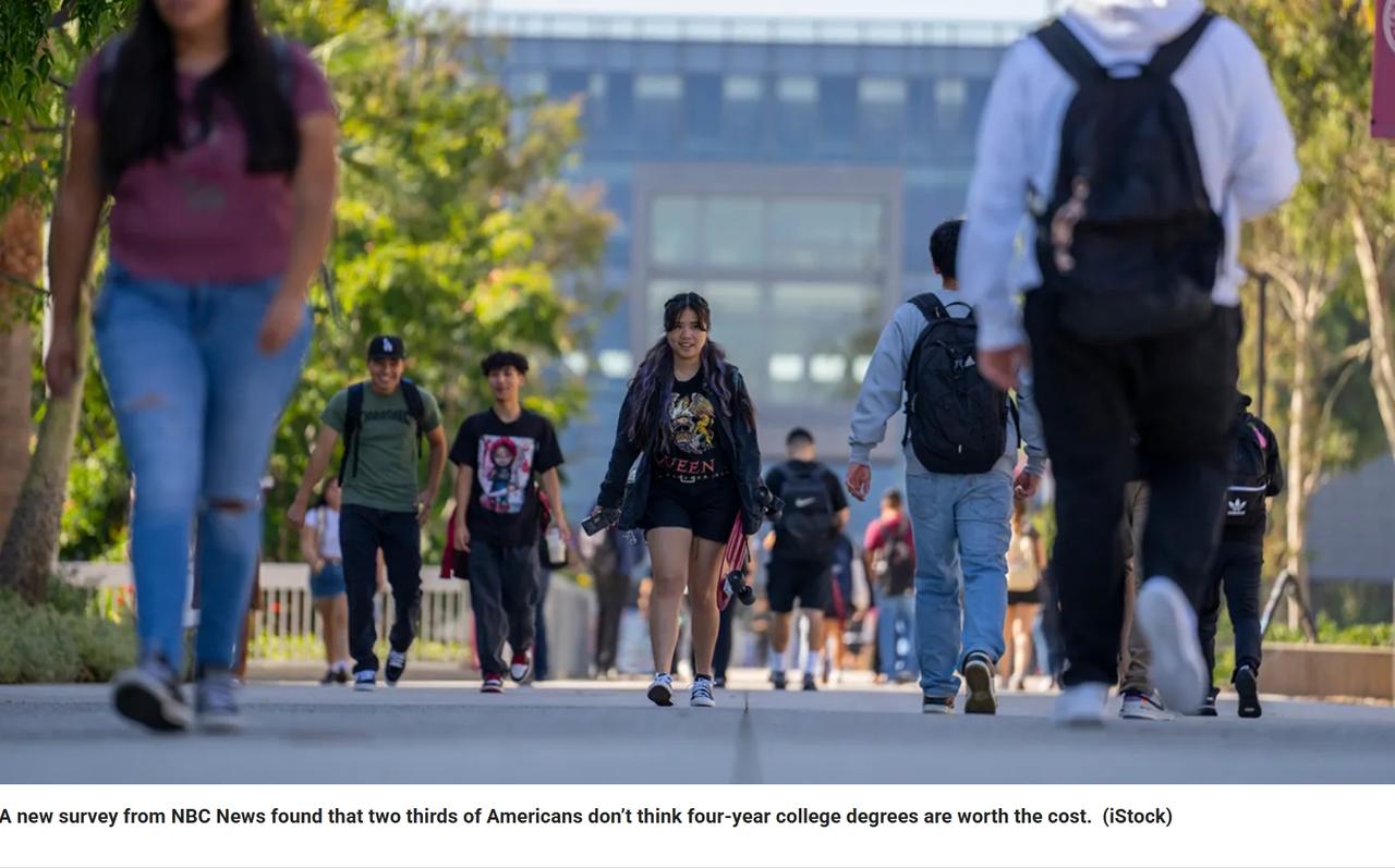 越来越多的美国人认为上大学得不偿失 根据美国全国广播公司(National Broadcasting Company)新闻的一项新调查发现,现在有三分之二的美国人认为四年制大学学位不值得花费。 调查发现,只有33%的注册选民同意四年制大学学位“值得花费,因为人们有更好的机会找到好工作,终生赚更多钱”。而63%的美国人则表示,他们认为四年制大学学位“不值得花费,因为人们毕业时往往缺乏特定职业技能,且背负大量债务”。 在2017年一项调查中,对此问题有49%的人认为学位值得付出代价,47%的人认为不值得。 CNBC(美国全国广播公司财经频道)在2013年作为全美经济调查的一部分提出了同样的问题,当时53%的人认为学位值得投入,40%的人认为不值得。 根据CNBC的数据,2024-2025学年四年制私立学院的平均学费和杂费,加上住宿和膳食费用约为58,600美元。