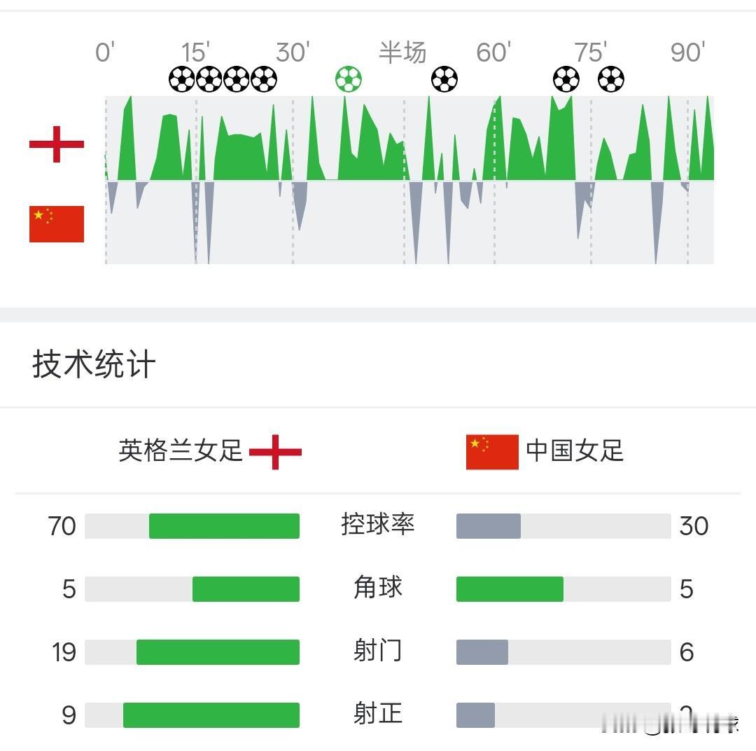 中国女足0-8惨败英格兰,中国女足开场23分钟就0-4落后,英格兰队控球率70%,全场轰出19次射门,中国女足只有6次射门。 英格兰女足世界排名第四,中国女足世界排名第十六,比赛完全一边倒,中国女足和世界强队之间的差距也越来越大。