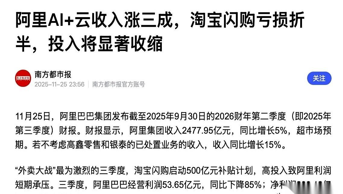 别听外面那些人瞎嚷嚷说“外卖仗打不动了”,那是还没看懂行情的门道。 就在大家都以为地主家也没余粮、准备勒紧裤腰带过冬的时候,阿里的财报直接给了个响亮的耳光。 咱们得看透本质——利润是降了点,但你看看核心电商那一块,还是稳稳的一百多亿进账。最吓人的是啥?是那个淘宝闪购。 这玩意儿简直是在“逆天改命”。 一边把规模做大,一边还能把亏损(UE)直接砍掉一半。这是什么概念?这就好比你车速越来越快,油耗反而还低了。 这说明啥?说明人家早就过了那个只会傻砸钱的草莽阶段了。 现在的玩法变了。在这个谁都想省钱、谁都讲效率的节骨眼上,谁能跑通“规模涨、亏损降”这条路,谁就是真正的狠角色。 阿里的算盘打得噼里啪啦响:先用真金白银把用户圈进来,再用技术手段把效率提上去。这不是打一枪换一个地方,这是拿着地图在推土。 所以啊,别天真地以为这仗要消停。 当一个巨头开始谈效率、谈优化,而且数据还这么漂亮的时候,那才最可怕。这不是要撤退,这是蹲下来系个鞋带,准备下一轮冲刺了。 本地生活这场戏,真正的高手过招,才刚刚开始。