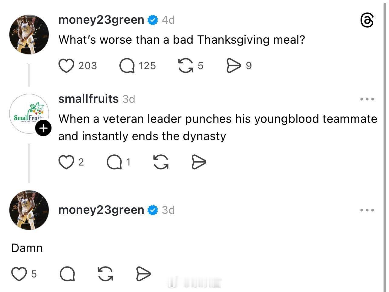 丹尼·格林称追梦格林是角色球员,“把他放到黄蜂,他能成为球星(Star)吗?要不是巨头(Big),他就是角色球员。”另一边,格林在社交媒体和网友互动,什么称得上是一顿不好的感恩节大餐?有人回:一个球队的老将拳打他年轻的潜力队友,王朝随即被结束。格林:Damn(我靠)!