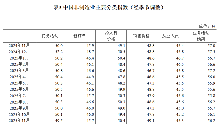 11月份,非制造业商务活动指数为49.5%,比上月下降0.6个百分点。