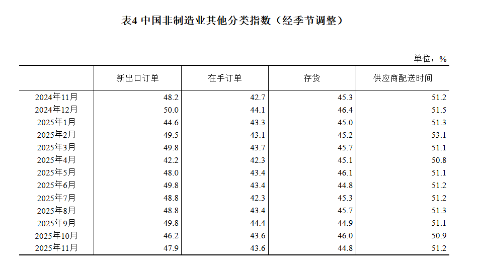 供应商配送时间指数为50.1%,比上月上升0.1个百分点,表明制造业原材料供应商交货时间略有加快。