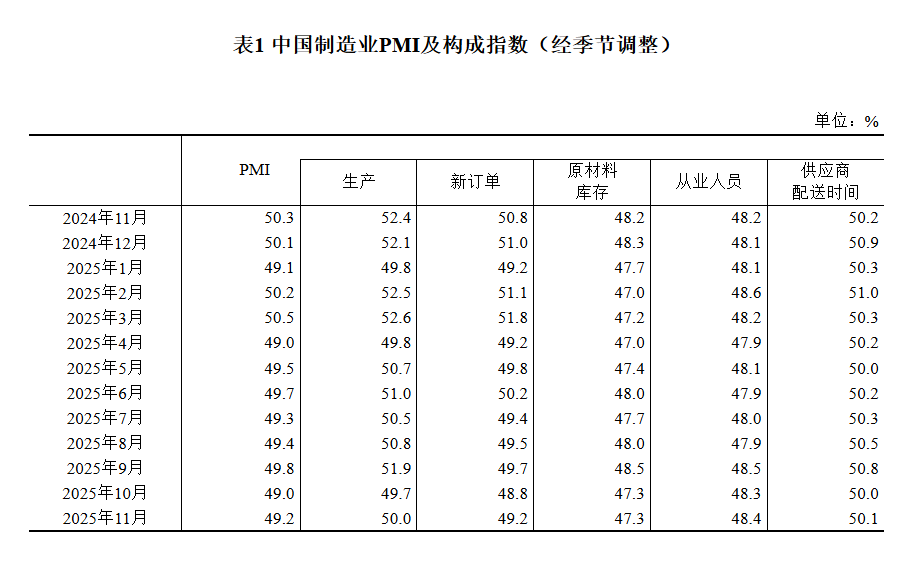 国家统计局:11月份制造业PMI为49.2% 比上月上升0.2个百分点