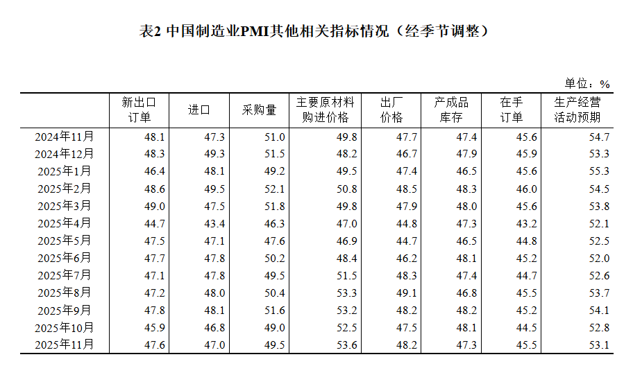 生产指数为50.0%,比上月上升0.3个百分点,位于临界点,表明制造业生产总体稳定。