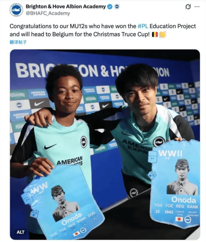 讽刺的是,作为一个反战主题的活动,三笘薰手中的卡片印着的竟然是二战时期著名日军小野田宽郎。