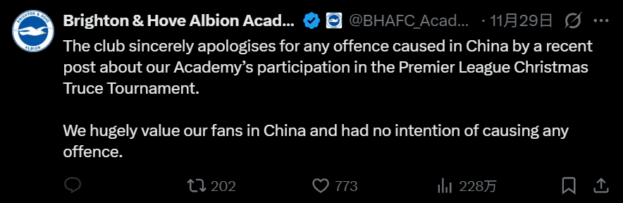 11月29日,布莱顿官方通过布莱顿青训学院的账号发表了一则道歉声明: