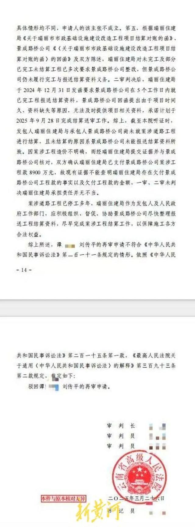 随后,刘传平、谭某将瑞丽市住建局告上法庭,要求其在欠付工程款范围内承担支付责任,然而三级法院均以“未结算即无法查明欠付金额”为由驳回诉请。不过,法院也明确要求,案涉道路工程已停工多年,瑞丽市住建局作为发包人及人民政府工作部门,应积极组织、督促、协助景成路桥公司尽早完成案涉工程结算工作,以保障施工各方合法权益。