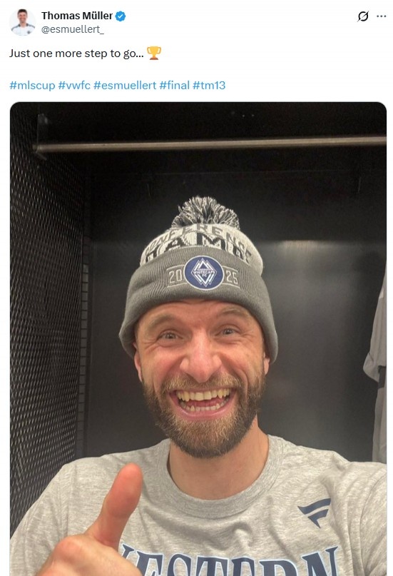 在本场比赛后,穆勒更新社媒并晒图:我们离美职联总冠军仅一步之遥!