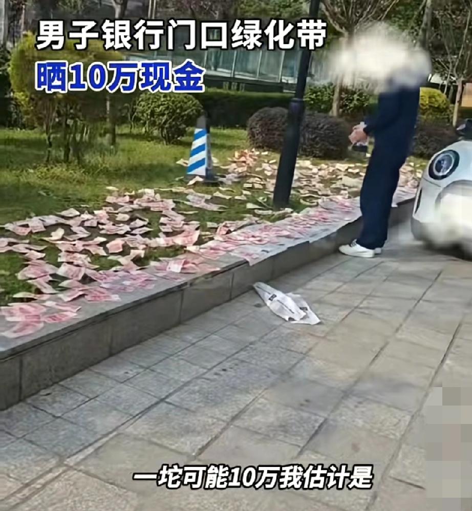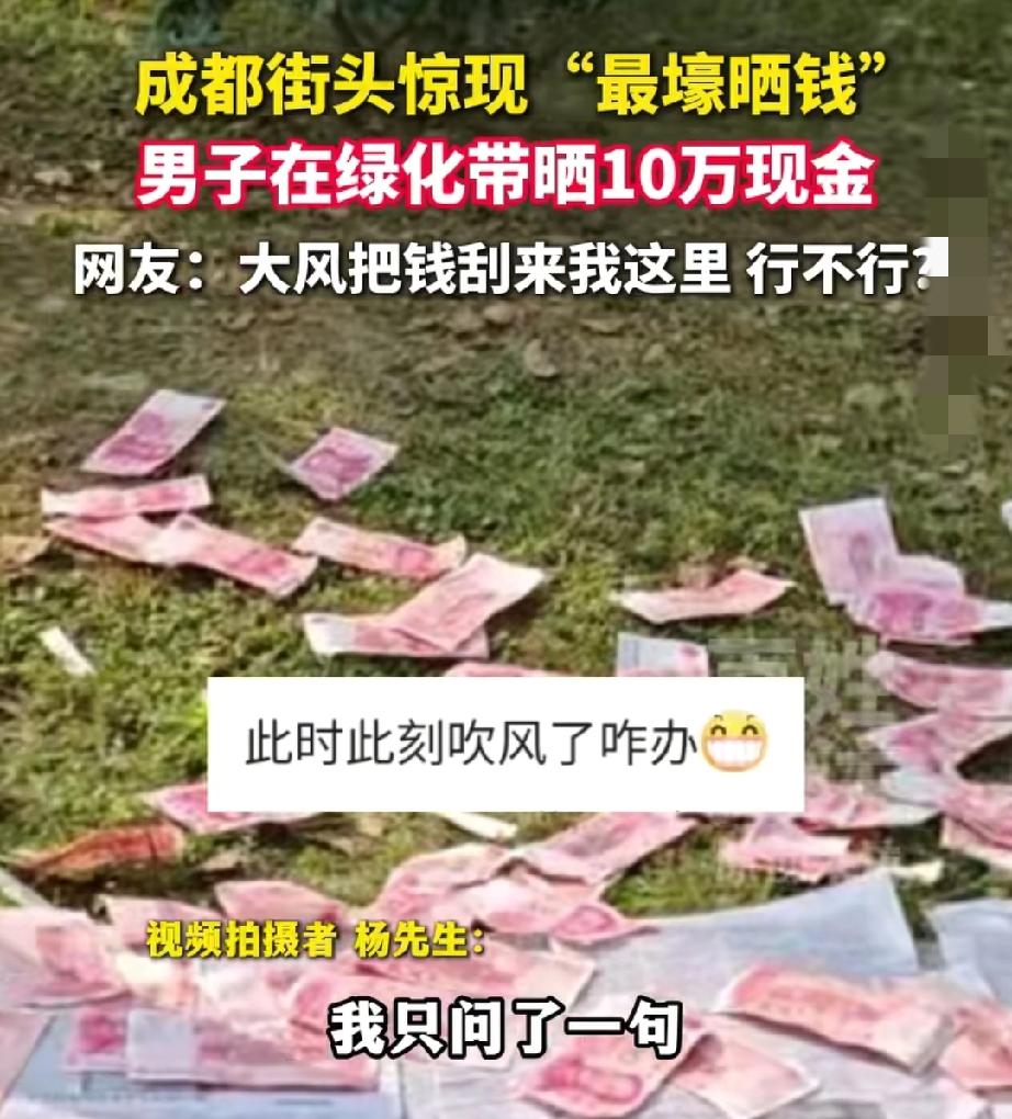 成都大哥绿化带晒10万现金的操作,简直把“安全感拉满”写在了明面上! 红彤彤的