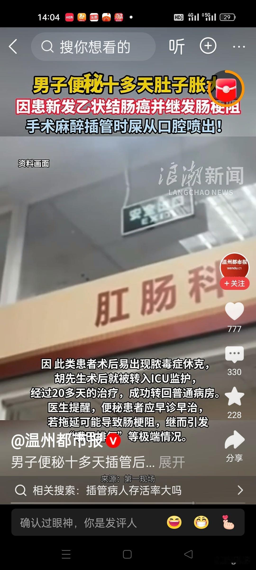 最近“一男子便秘十多天后粪便从口腔喷出”的话题冲上热搜。七十多岁的胡先生起初以为是普通便秘,家人也没重视,他就一直憋着,肚子越来越胀。送医后发现是新发乙状结肠癌肿瘤继发肠梗阻,肠管被肿瘤堵死。麻醉医生插管时,粪便直接从他口腔喷出,术中肠管肿胀充血。 术后胡先生转入 ICU 监护,二十多天才转回普通病房。这事儿给咱提了个醒,便秘千万别不当回事,它可能是大问题的信号,早诊早治才是王道。
