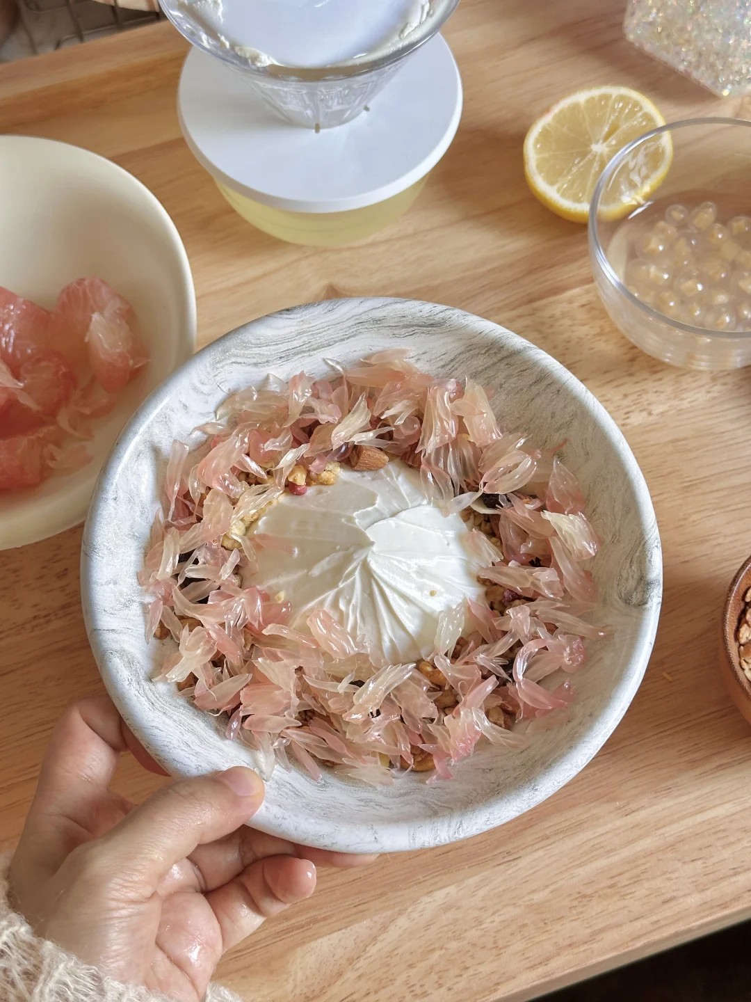 ·椰子酸奶提前过滤成酸奶球,摆在酸奶碗中