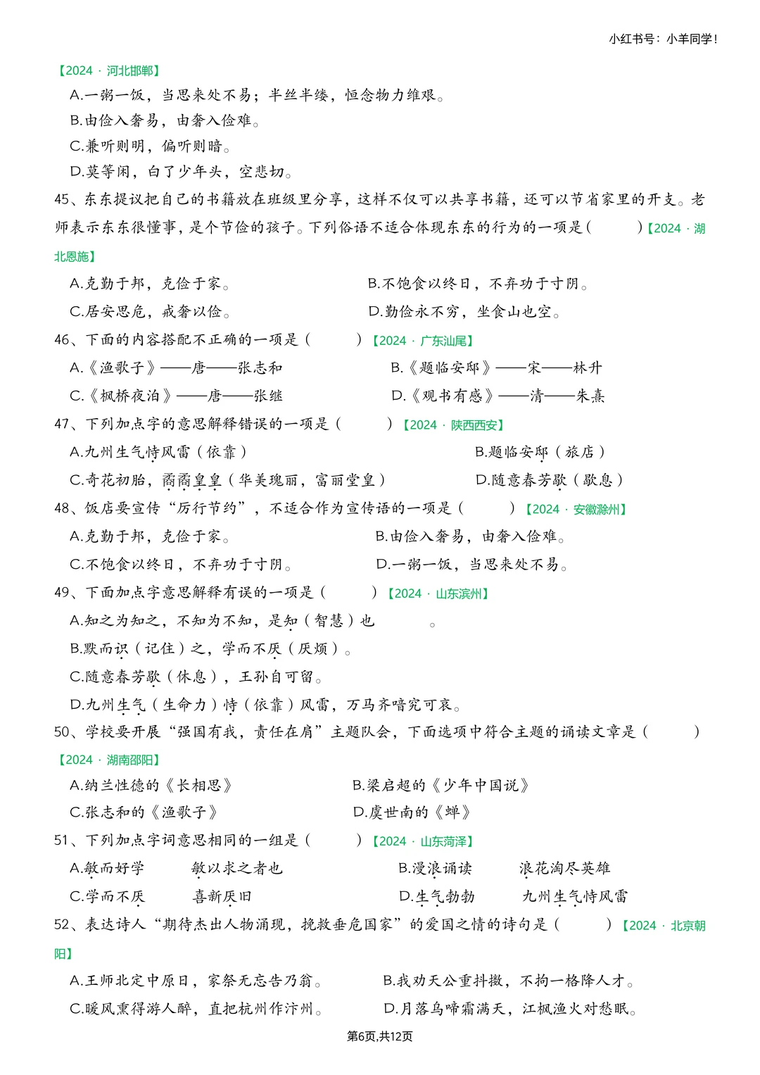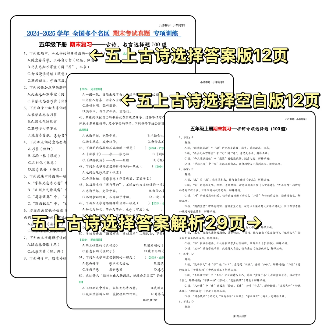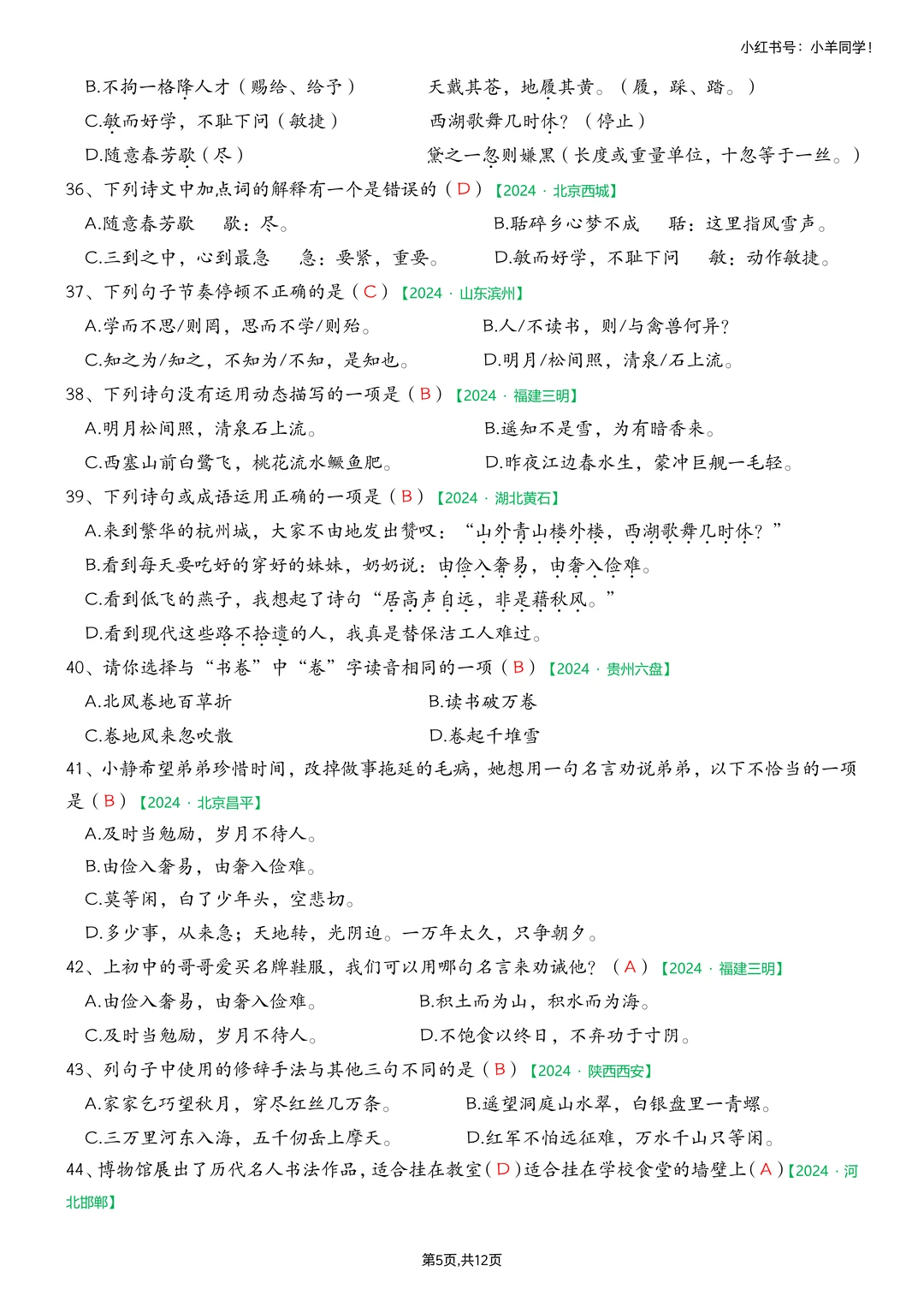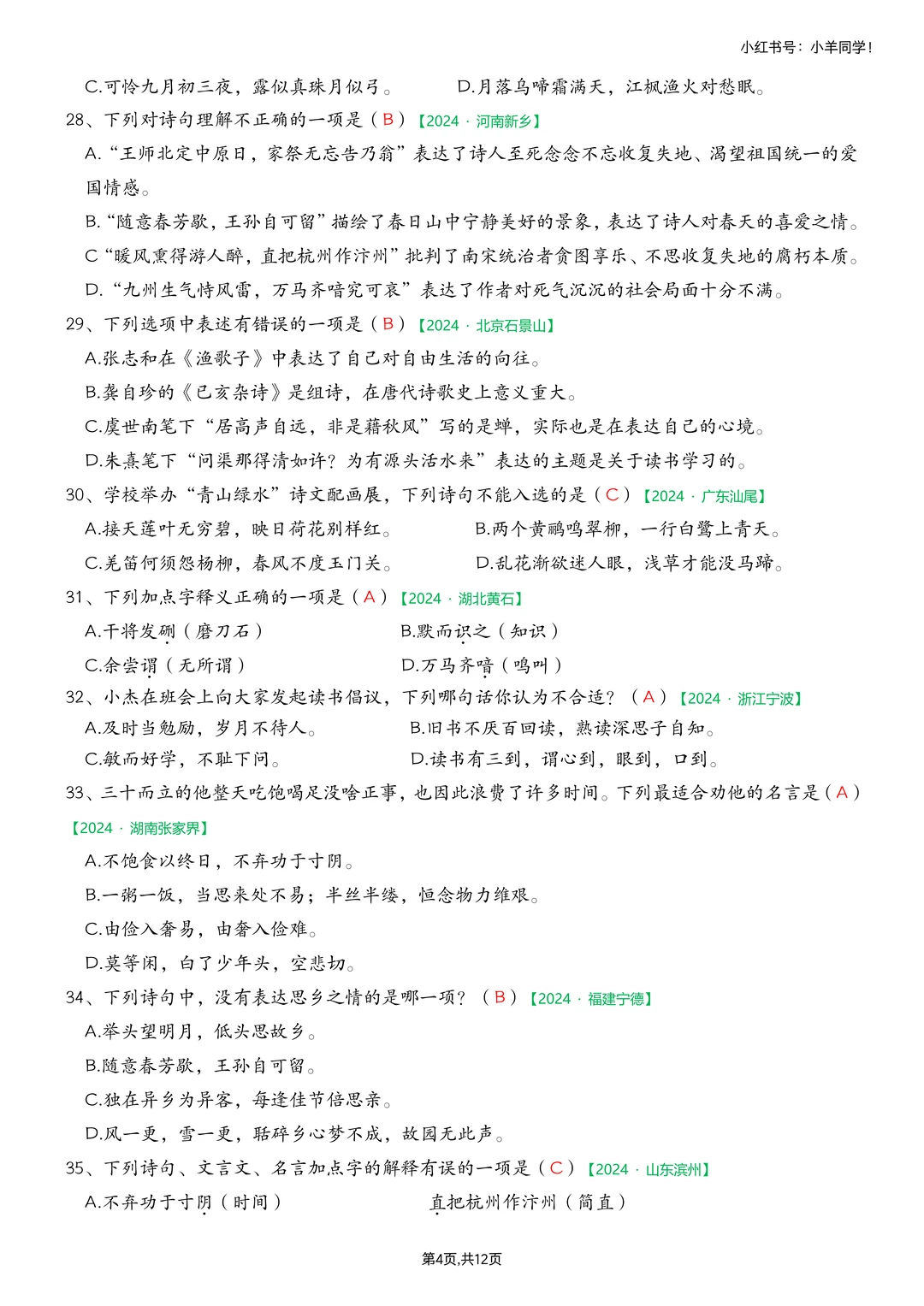 是以2024-2025学年各地区期末真题试卷整理,其中理解性选择较多,对古诗的理解足够透彻,方可错误遗漏,不然很容易出错。