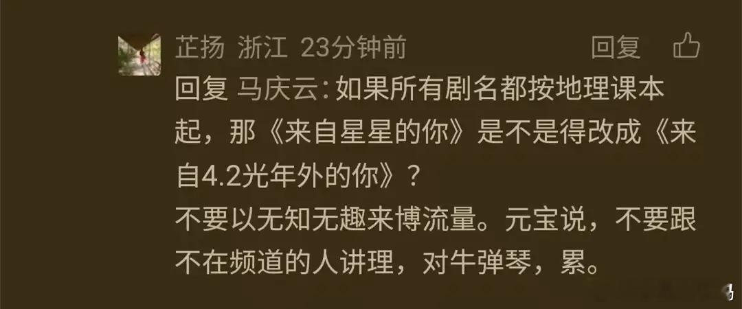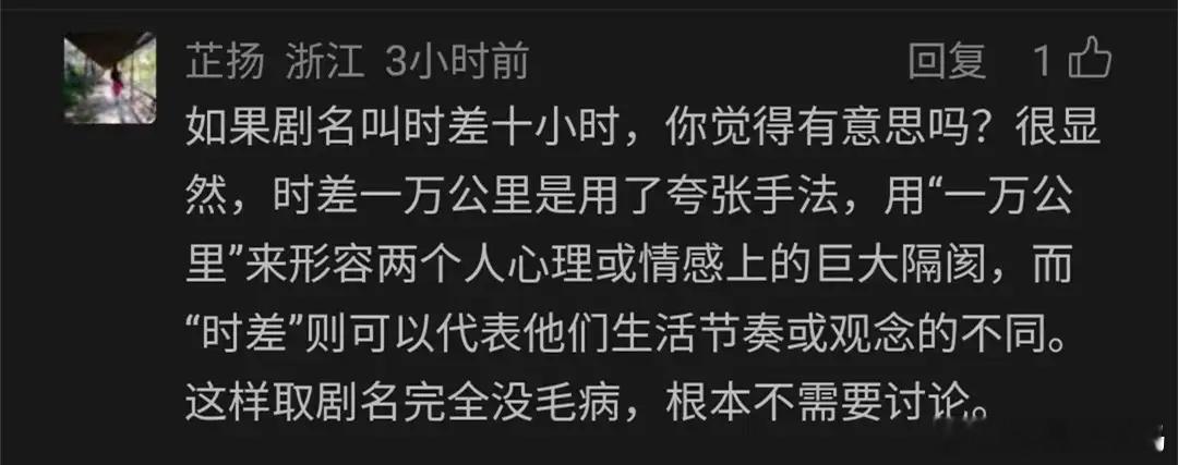 有网友认为《时差一万公里》的“剧名常识错误”,是用“通感”可以洗的吗?至少应该通过官方媒体平台发一个公告,告知该剧的观众,尤其是那些粉丝型的观众,“时差”不能和“一万公里”对应起来,两者是不同的概念。