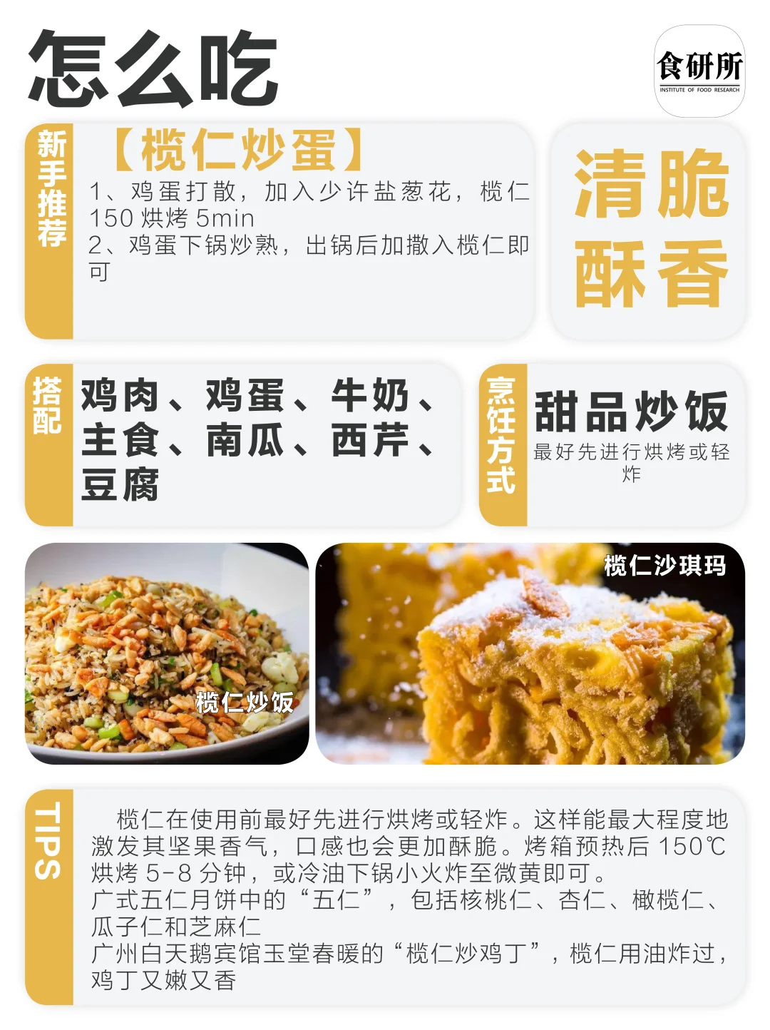 [握手R][握手R]榄仁在使用前最好先进行烘烤或轻炸。这样能最大程度地激发其坚果香气,口感也会更加酥脆。烤箱预热后150℃烘烤5-8分钟,或冷油下锅小火炸至微黄即可。