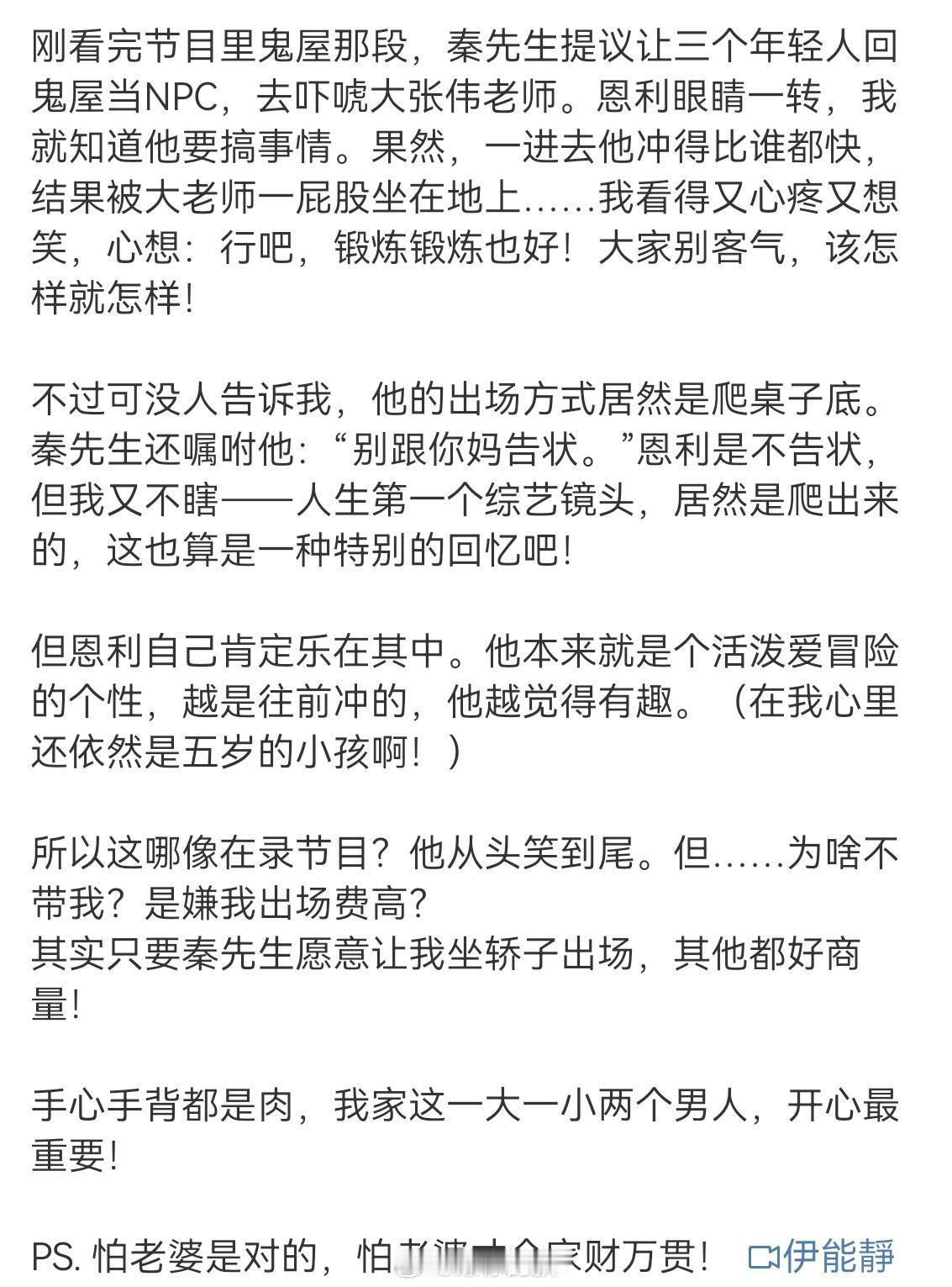 伊能静回应恩利综艺首秀看到伊能静给第一次参加综艺的恩利发小作文,从字里行间就能感受出伊能静对儿子满满的爱,虽然伊能静感觉恩利刚毕业阅历较浅,不敢让他参加综艺,但秦昊说“不妨放养一点”,于是恩利的综艺首秀就来到了秦昊常驻的快乐趣吹风