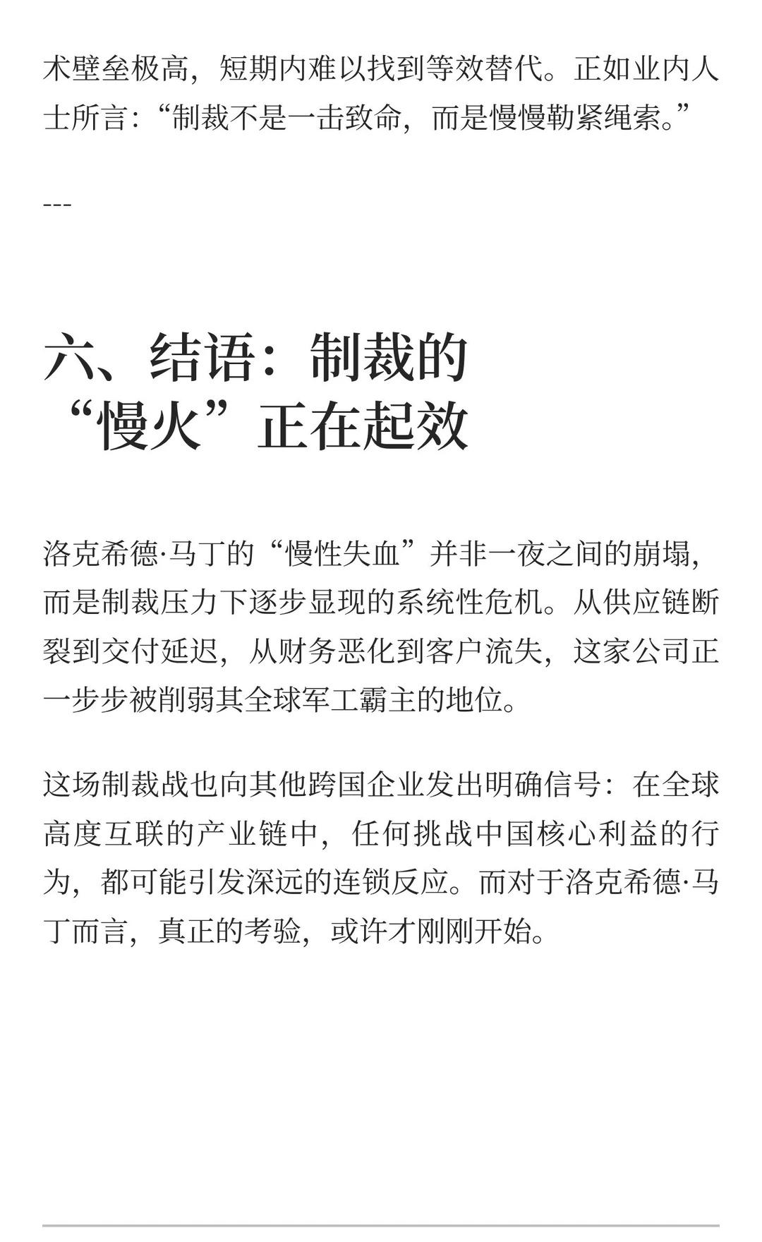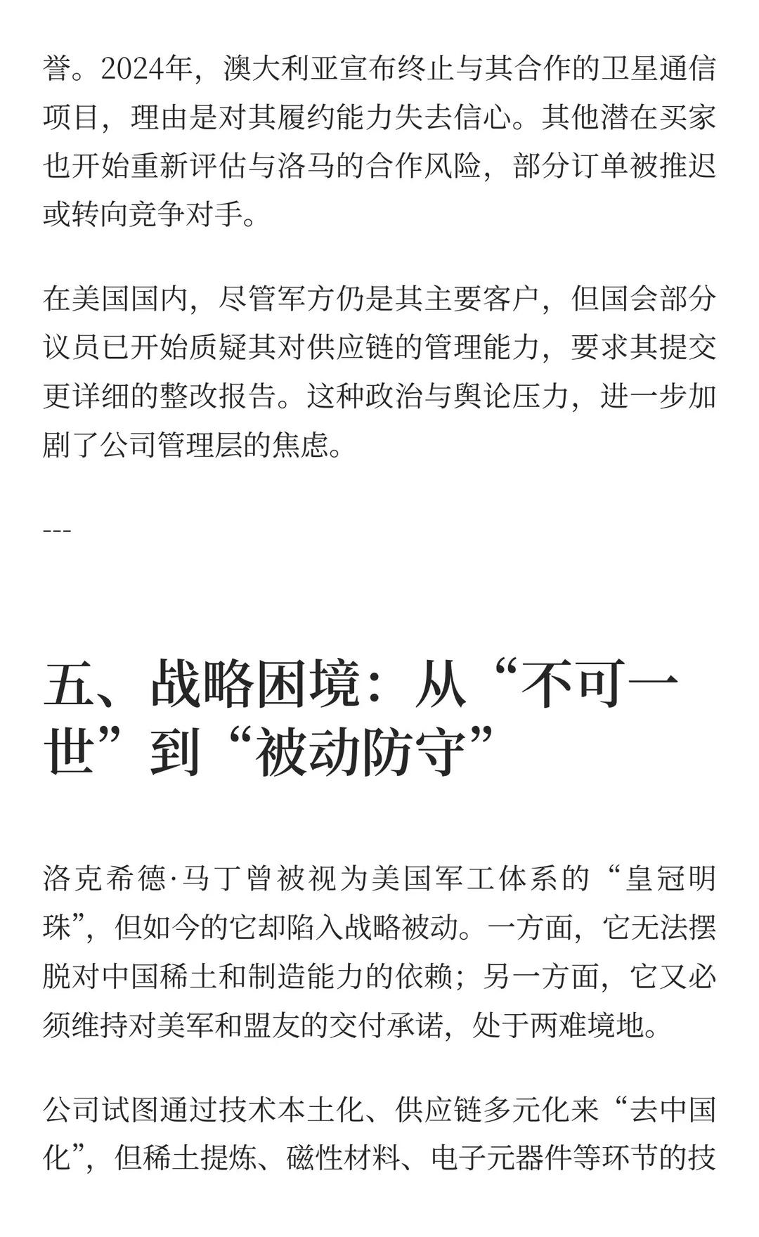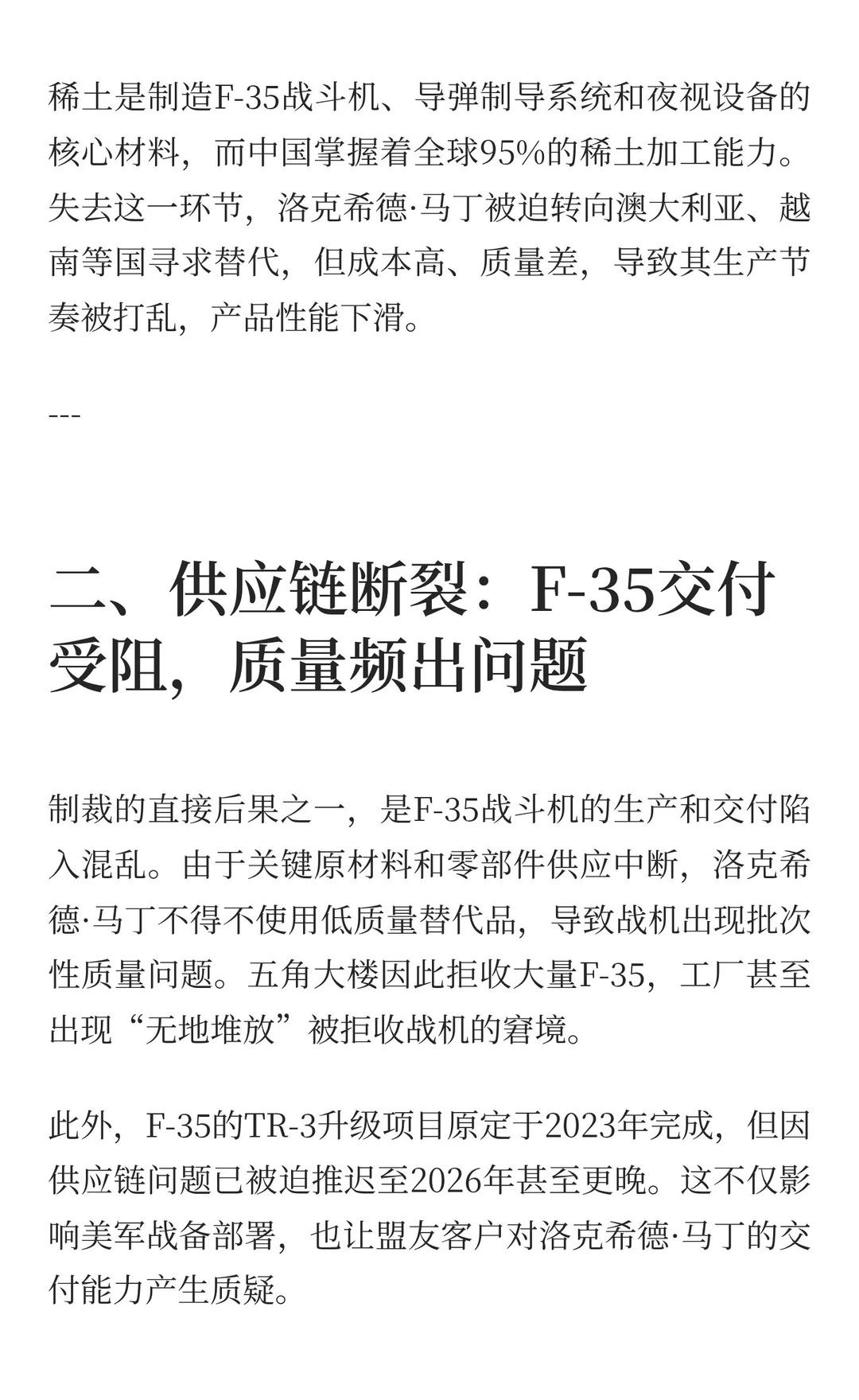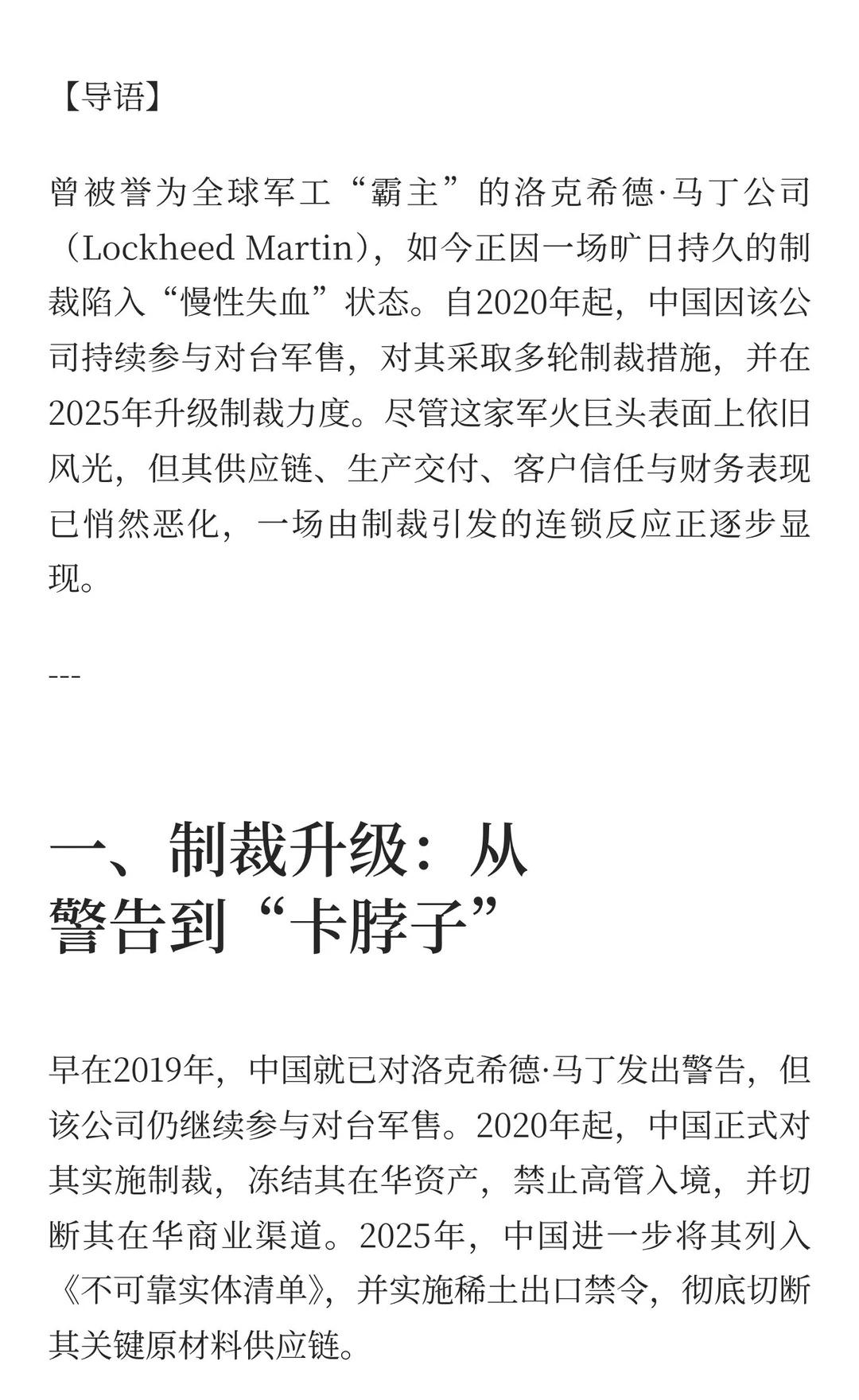洛克希德·马丁“慢性失血”:制裁下的状况 洛克希德·马丁因参与对台军售,2020年起遭中国制裁,切断稀土供应,导致F-35交付延迟和质量问题,财务状况恶化,客户流失,国际声誉受损,陷入供应链和财务困境,战略被动。 洛克希德马丁 中国制裁美国军工企业 美国对台军售 阻止美国对台军售