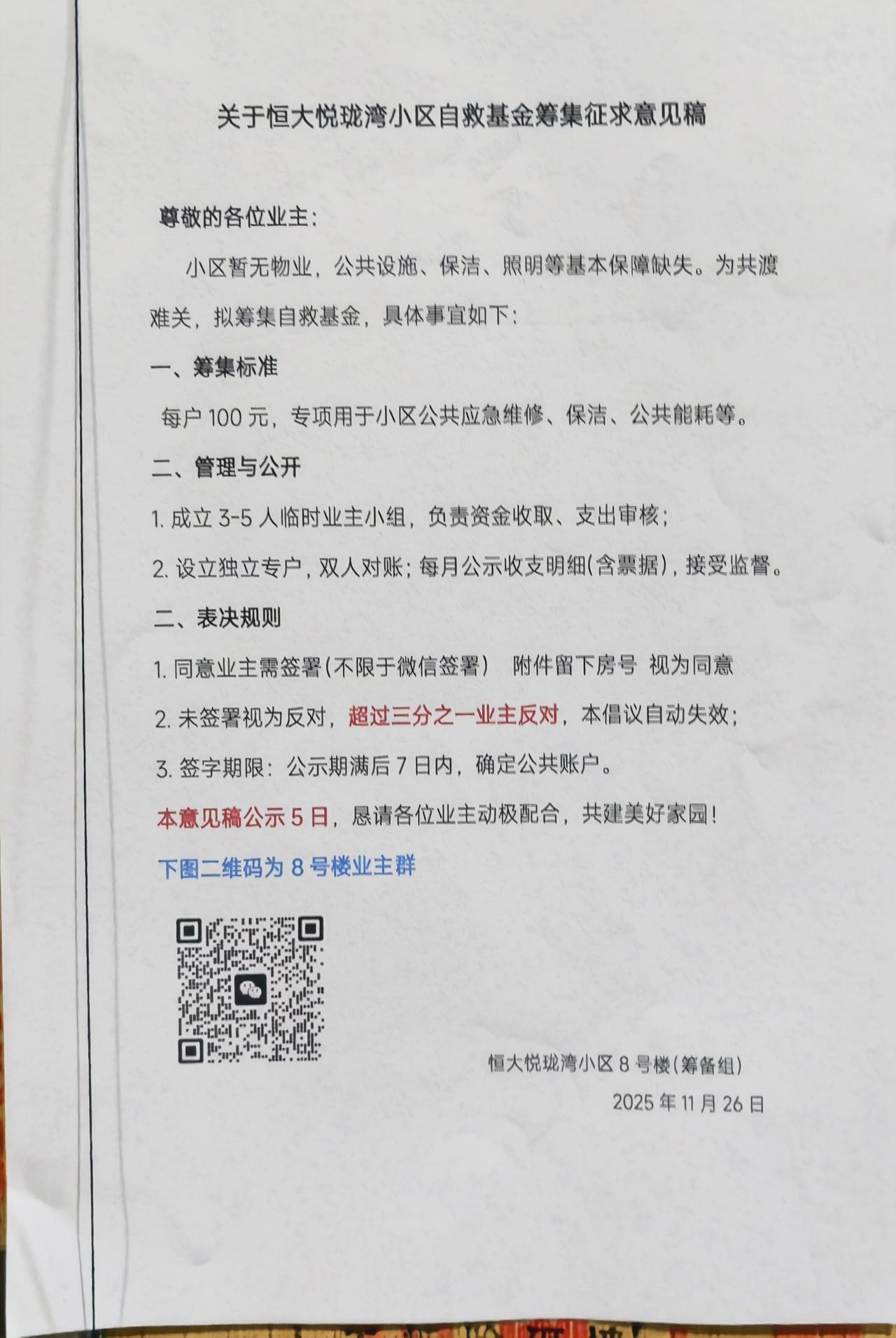 今天是金碧物业走后的第30天。 今天我把绿化带种菜的照片发到群里面。谁知却受到了指责,说我为什么不顺手把它拔掉?说我把照片发到群里有什么用?也有人提议说组织人去把它拔掉,或者找一把铁铲,把他的产品或者用脚踩,把它全部踩死。我看四周无人,低头拔了一半。等以后有机会再慢慢把它拔掉,毕竟我不想被人家报复。 今天我们这幢楼自筹资金的,开始收钱了,到目前为止已经有55个人交了100块钱。我们这幢楼开宽带的有73户,还有若干户,拿了钥匙,没有入住的,也有不少交了100元钱。 有了这笔钱,第1件要做的事情,就是先把电瓶车充电棚充电桩修好,然后把路灯装起来,每动用一笔钱都会在群里面公开公布。直到钱用光之后才会再筹集资金。因为是自愿筹集的,所以难免有些人白嫖。 今天正好是一个月结束,再过几天就能知道我们的公共用电会不会被停掉。如果公共用电被停掉,那对于我们住在20层以上的住户来说,简直就是灾难。 今天楼下停了好多车,起初以为这里的赌场又开了。后来听群里人说后才知道,好多外小区的人到我们这边来钓鱼。搞得车位都满了,都没处停车。