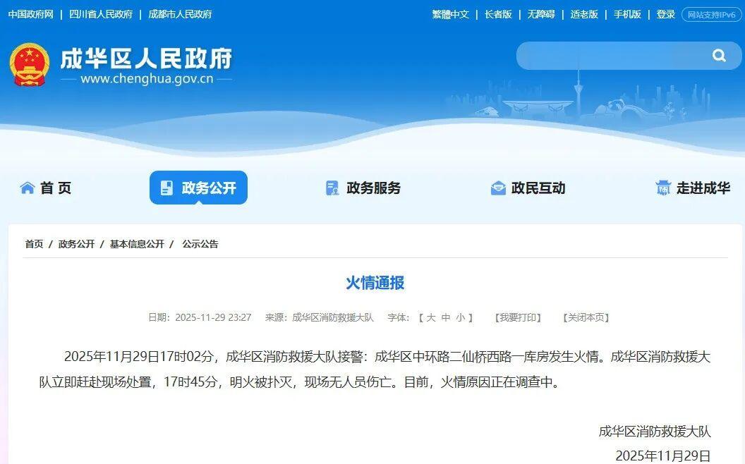 2025年11月29日17时02分,成华区消防救援大队接警:成华区中环路二仙桥西路一库房发生火情。成华区消防救援大队立即赶赴现场处置,17时45分,明火被扑灭,现场无人员伤亡。目前,火情原因正在调查中。