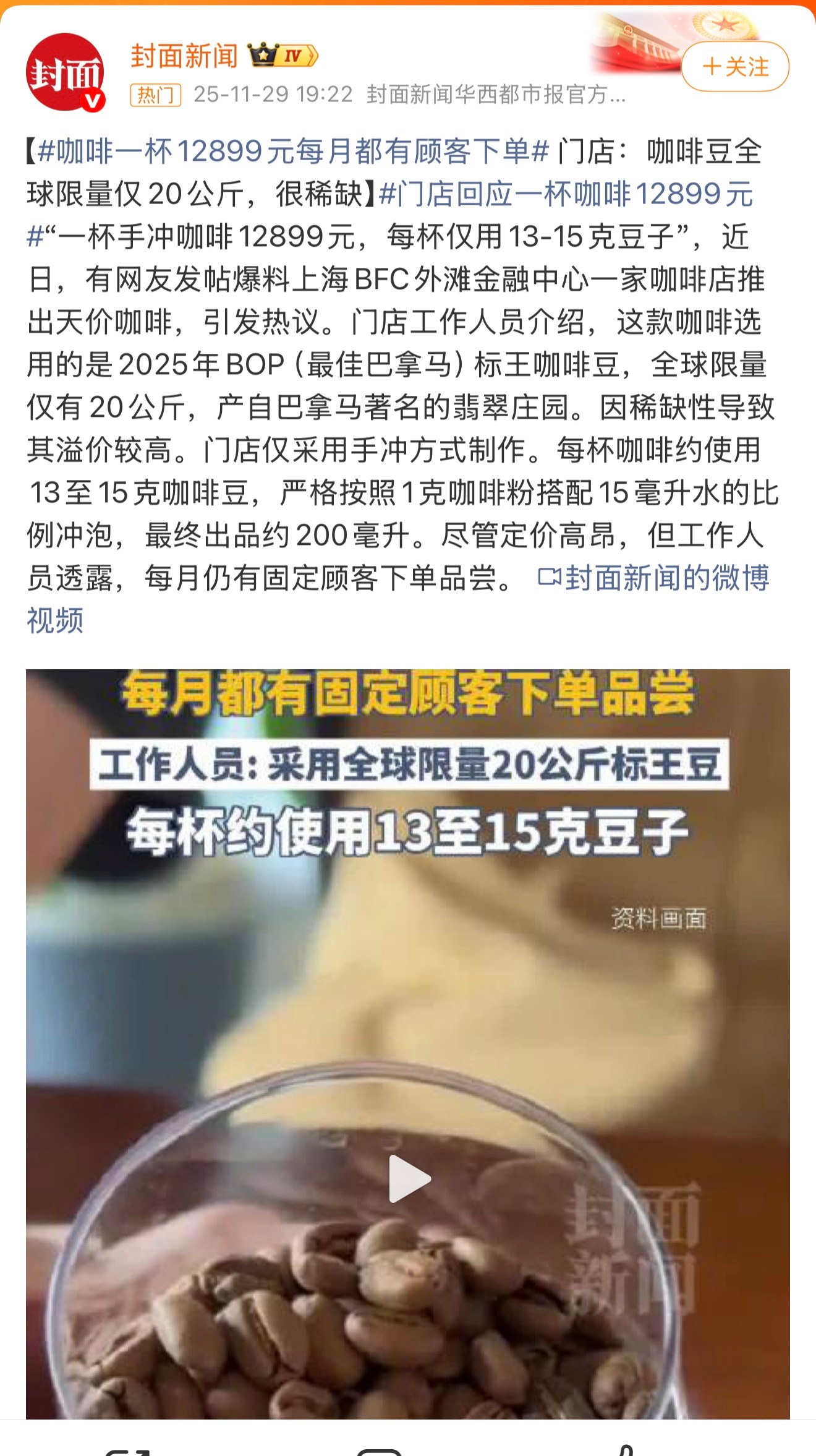 上海 12899元咖啡采用全球限量咖啡豆,并且每月都有人下单,每杯仅用13-15克豆子。当然这也是明码标价,童叟无欺,觉得贵可以不买,别人卖十万也没毛病,只要没有强买强卖就行。