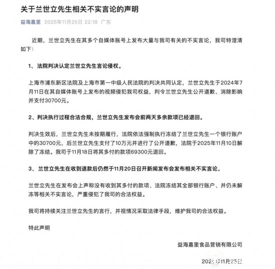 11月25日,金龙鱼母公司益海嘉里在公众号发布声明称,益海嘉里已在兰世立召开发布会前两天将多余款项退回账户,兰世立在新闻发布会上发表的言论为“不实言论”,公司将视情况采取法律手段维护自身合法权益。