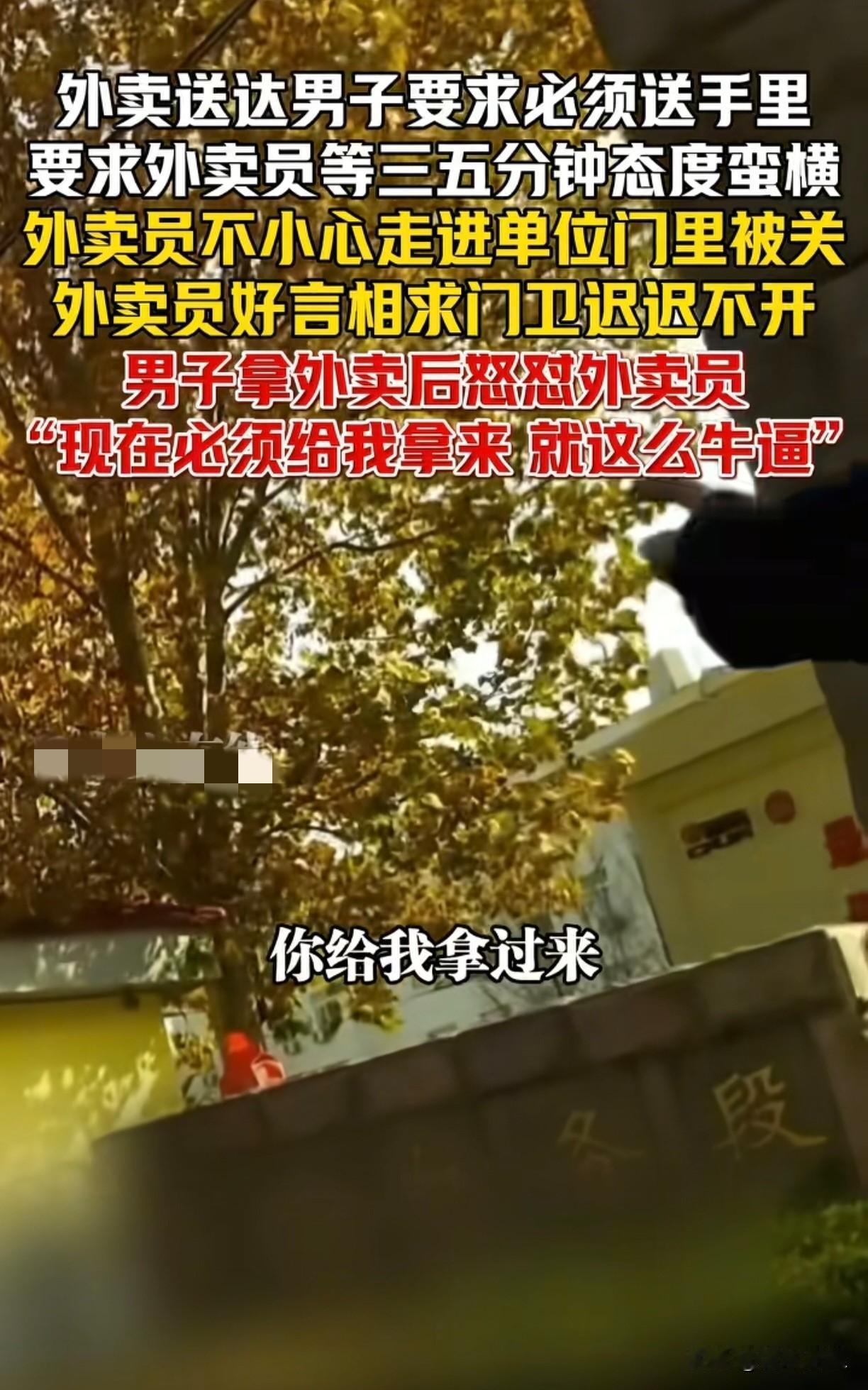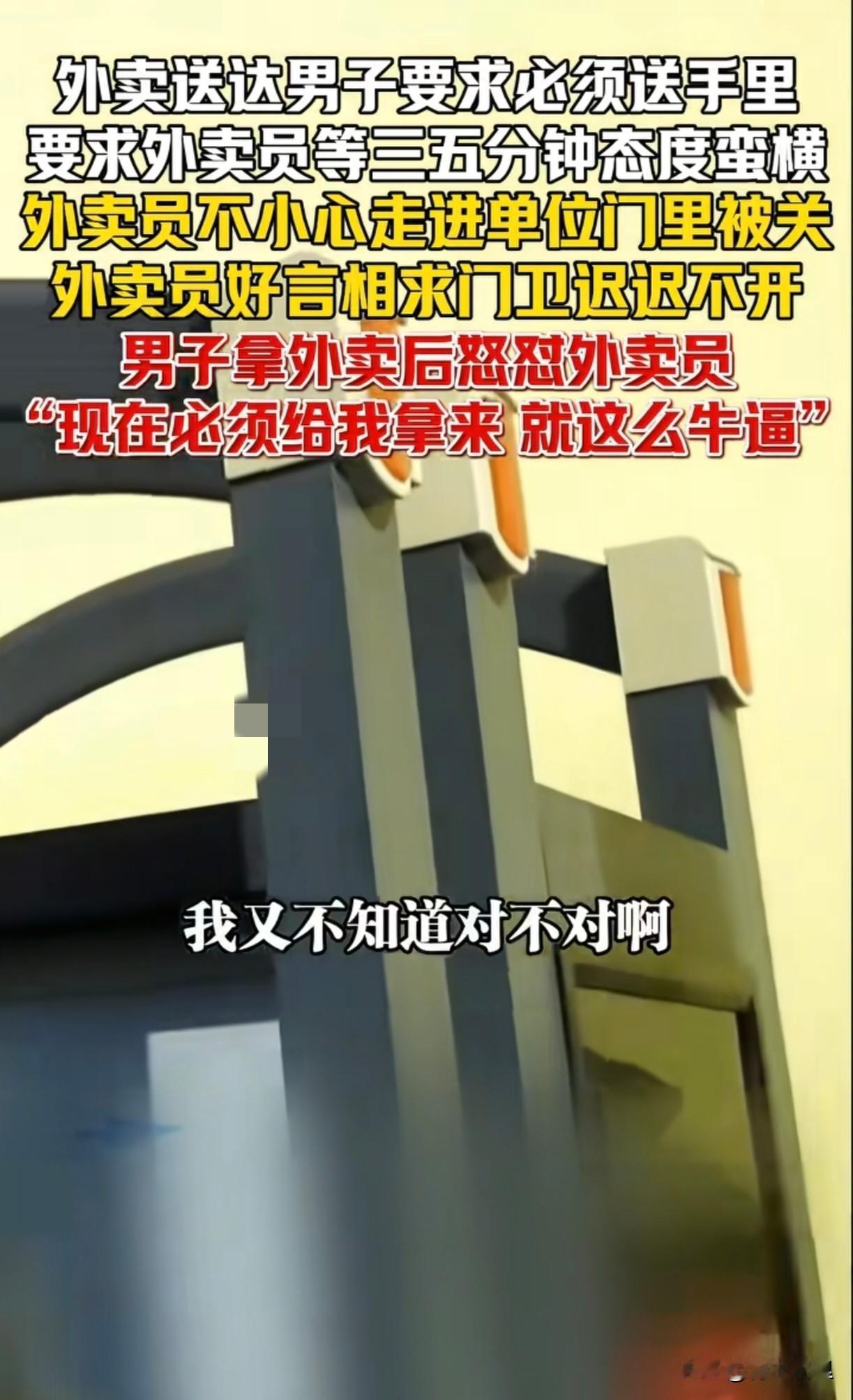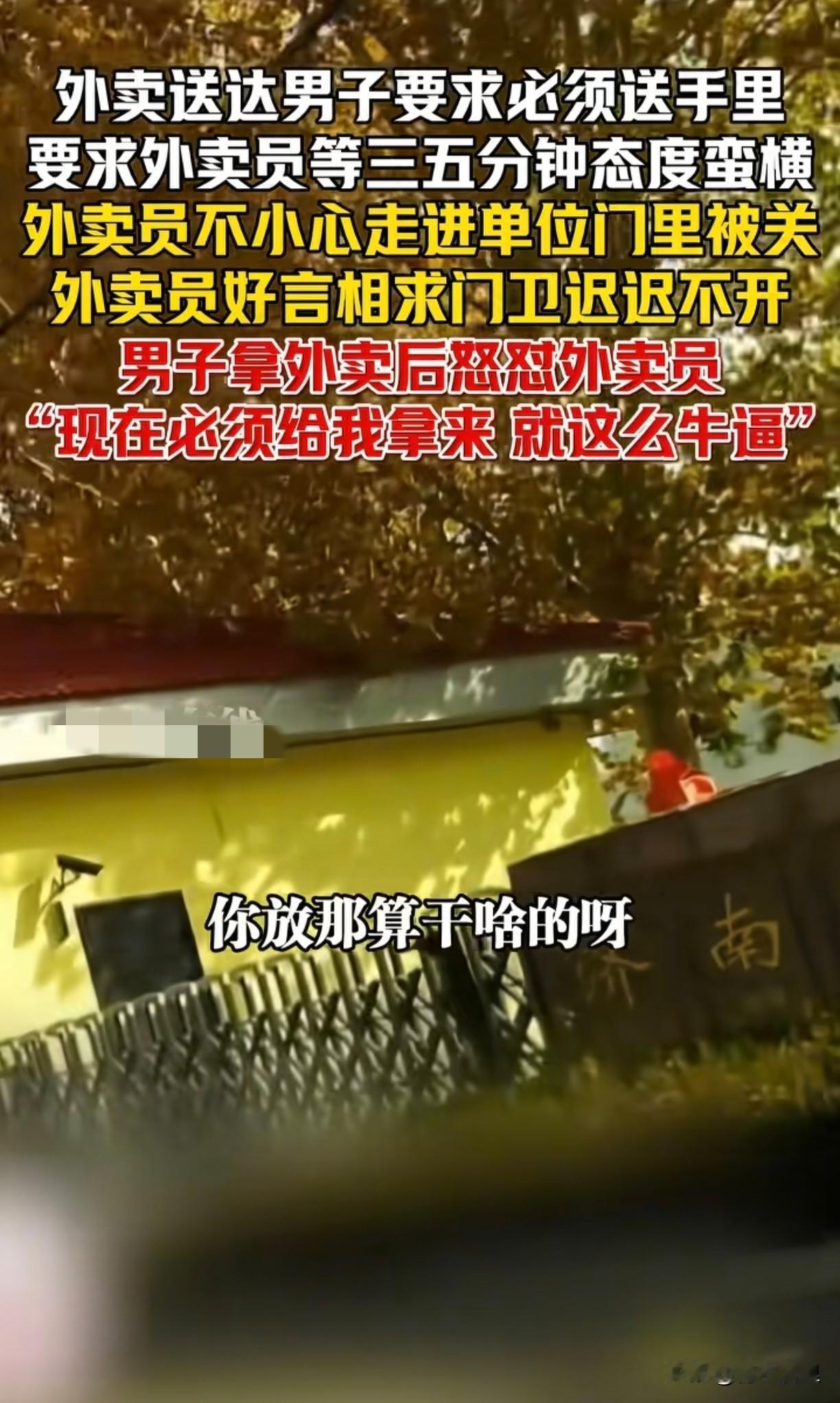 济南一女外卖员接了一个机务段的外卖单。送到后联系男子取餐,对方却迟迟不下来,要求女子等三五分钟。女子就语气很委婉的问放在传达室行吗?男子强硬表示不行,必须要送到手里。 眼看后面的单子就要超时了,女子就把外卖放在单位里的围墙上了。刚准备出去的时候发现门被关了,门卫声音很大,说这里不让进,谁让你进来的。女子说:不知道这里不让进,并一个劲的道歉,但门卫却迟迟不开门。 后来取餐男子下来了,问我外卖呢?女子指了指围墙,男子拔高声音:“你放那干嘛,我不是来了吗,你给我拿来,就是这么牛逼”。女子不愿,说句“爱要不要”就离开了。女子也是被气边骑车边哭,手里的其他单子也因这事超时了。 真是好大的官威。员工和门卫都搁那摆谱。你只是点了份外卖而已,不是买断了人家的尊严。人家小姑娘辛苦工作,送外卖,讨生活。何必刁难别人。这么做,实在说不过去。