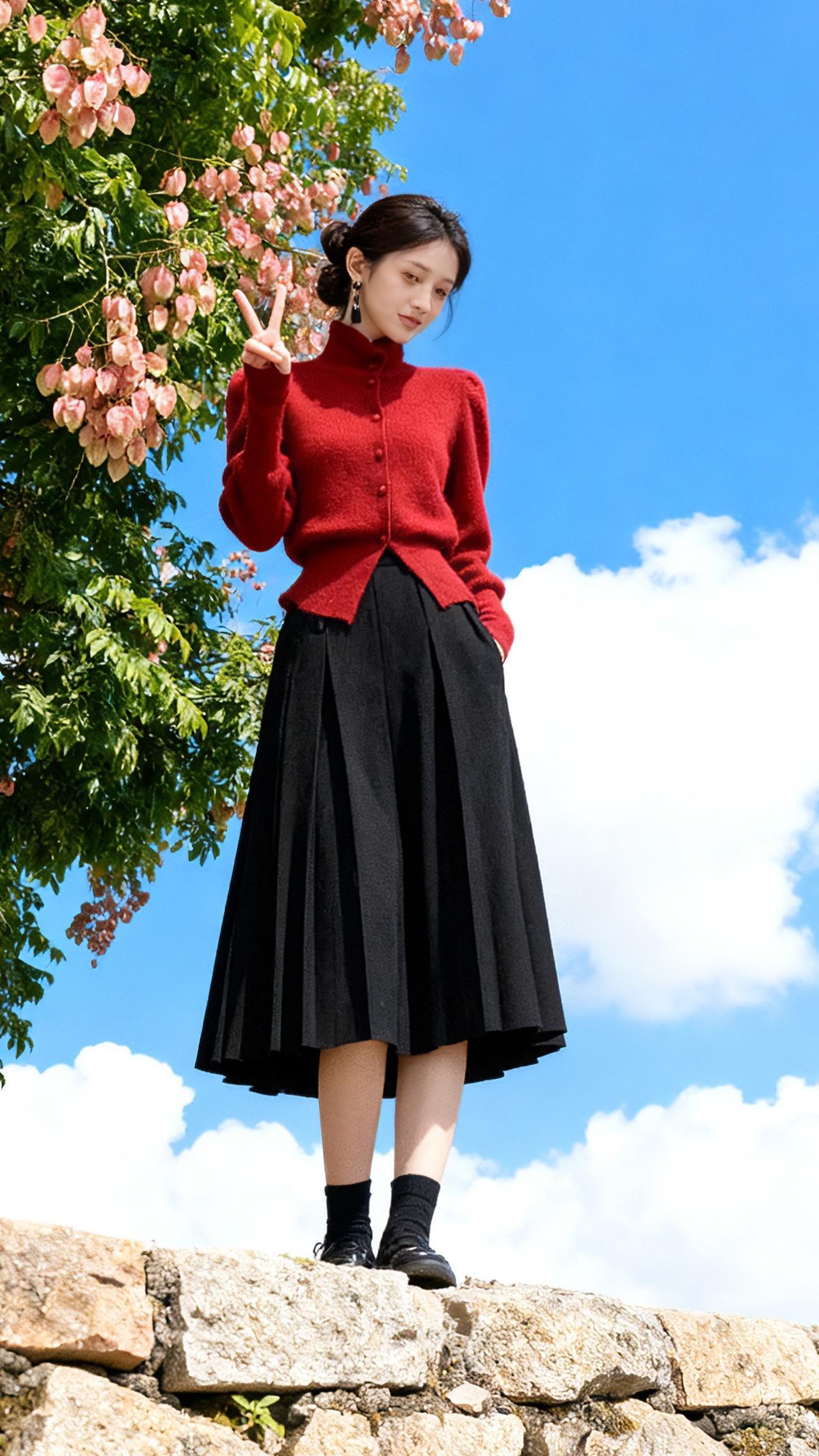 2025秋冬新款红色高领单排扣毛衣女秋冬修身显瘦短款针织开衫洋气出游穿搭