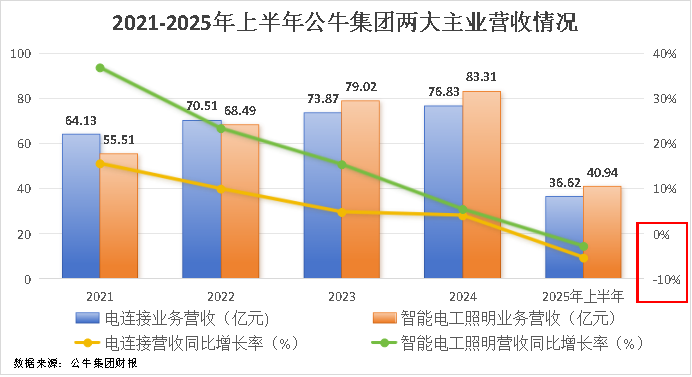 这几年,公司的电连接和智能电工照明业务的营收增速持续放缓,直到出现了负增长。2025年上半年,二者分别实现营收36.62亿元和40.94亿元,同比下降了5.37%和2.37%。