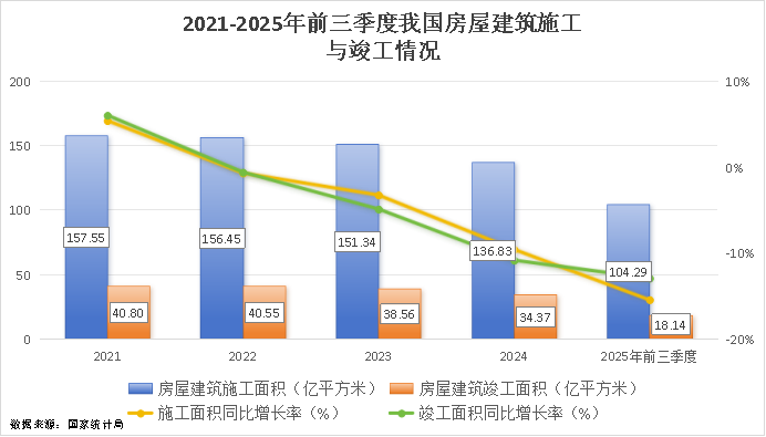 近年来,我国的房地产行情持续下行。2025年前三季度,我国的房屋建筑施工面积和竣工面积分别为104.29亿平方米和18.14亿平方米,同比下降了15.47%和12.96%。