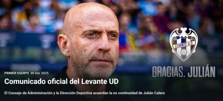 直播吧11月30日讯莱万特本赛季14轮仅9分,当前位列西甲积分榜倒数第二。俱乐部官方宣布,董事会与体育管理层已达成一致,朱利安·卡莱罗将不再担任男子一线队主教练。俱乐部官方声明如下: