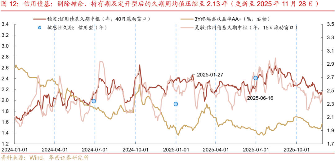 11月24-28日,或受基金赎回相关传闻扰动,债市仍然维持震荡格局。在此背景下,各机构对久期的博弈维持谨慎,利率型与信用型中长债基继续压缩久期。按照稳定模型计算,利率型中长债基久期周度平均值由前一周的3.51年压缩至3.49年,信用型中长债基久期周度平均值则由前一周的2.14年压缩至2.13年。