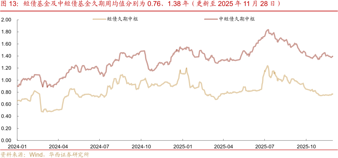 中短债基金久期持续压缩,而短债基金久期则微升。其中,中短债基金久期周均值由前一周的1.40年压缩至1.38年,不过周内来看,中短债基金久期中枢先稳后升,周一至周三维持在1.38年附近,后两日逐步升至1.40年。短债基金久期中枢则由前一周的0.75年小幅升至0.76年。日度来看,短债基金久期则先升后稳,由周一的0.75年升至周三的0.77年后,维持这一水平直至周五。
