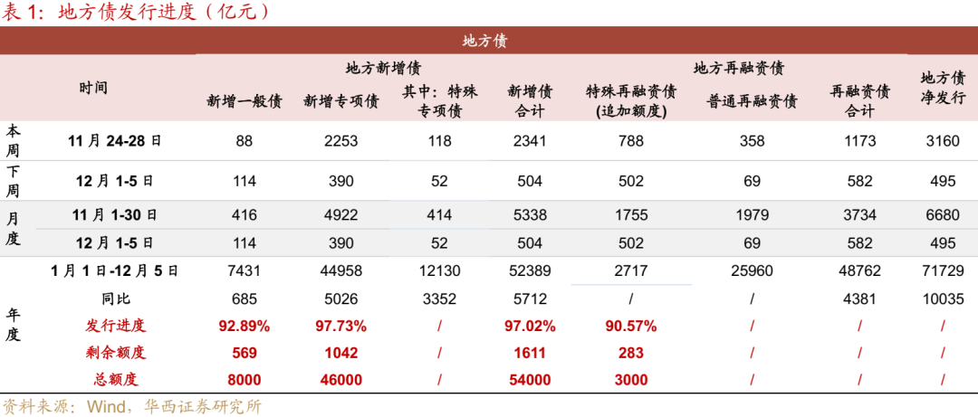 本周(11月24-28日),内蒙古、山西等6地披露用于偿还存量债务地方债发行计划,合计502亿元,其中云南发行一只7年期债券,规模为73亿元,其余发行期限均在10年期及以上。截至12月5日,用于偿还存量债务的3000亿结转限额发行规模合计2717亿元,发行进度90.56%。
