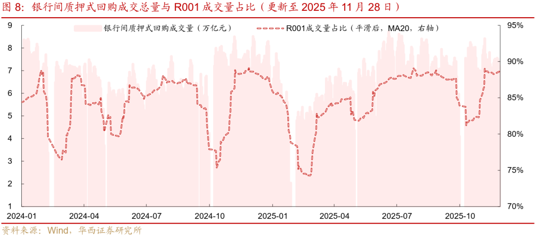 11月24-28日,随着税期影响消退,资金利率重新回落至OMO利率下方,整体保持平稳,仅在跨月当日小幅上升。不过受跨月影响,银行间质押式成交规模均值下降,由前一周的7.29万亿元降至7.09万亿元。