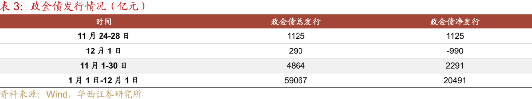 政府债供给节奏放缓。12月1-5日,政府债发行量为2317亿元,显著低于前一周的6036亿元。其中,国债已披露计划发行1230亿元,此外,3日还将发行2M、3M贴现国债各一只,我们预计国债总发行规模为1980亿元(周环比-542亿元);地方债计划发行1087亿元(周环比-2426亿元)。