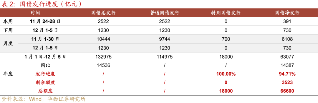 1月1日-12月5日,国债累计净发行63077亿元,同比多18918亿元,占6.66万亿额度的95%,剩余额度3523亿元。