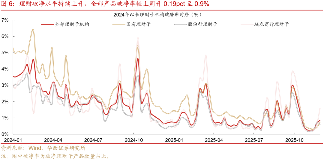 伴随含权、纯债类理财产品回撤幅度双双扩大,各类风险指标进一步抬升。理财破净水平持续上升,全部产品破净率较上周升0.19pct至0.9%。拆分各机构观察,国有行和城农商行较前一周分别上升0.32pct和0.97pct,分别至0.7%和1.6%。股份行则较上周下降0.14pct至0.6%。