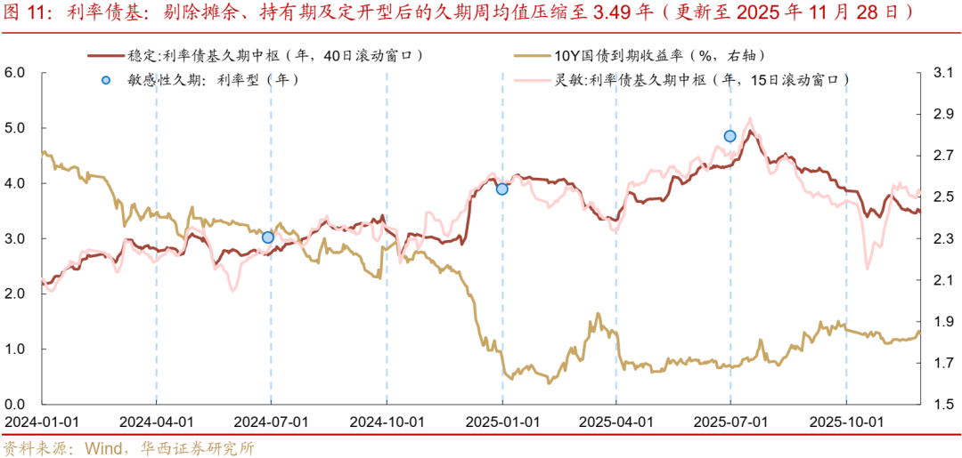 11月24-28日,本周债市或受基金赎回相关传闻扰动,仍然维持震荡格局。在此背景下,各机构对久期的博弈维持谨慎,利率型与信用型中长债基继续压缩久期。按照稳定模型计算,利率型中长债基久期周度平均值由前一周的3.51年压缩至3.49年,信用型中长债基久期周度平均值则由前一周的2.14年压缩至2.13年。周内来看,二者表现相反。利率债基久期为先升后降,由周一的3.46年升至周三的3.53年后,周五降至3.48年。信用债基久期则为先降后升,由周一的2.14年回落至周二的2.10年后,逐日攀升至周五的2.16年。