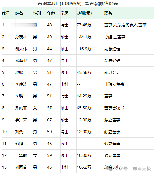 以下表格(薪酬数据来源于2024年年报,反映2024年在任期间的薪酬情况,其他信息根据公开信息更新到最新,反映最新情况)展示了首钢股份部分管理层人员的相关情况,包括姓名、性别、年龄、学历、薪酬以及职务等信息。其中薪酬是指报告期(年报报告期跨度为一年,但因为有的高管调动问题,报告期内不一定完全在本上市公司,所以有的高管薪酬也未覆盖全年)内从公司获得的税前报酬总额。